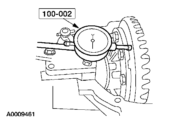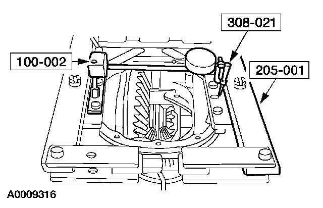 9. Force the differential ring gear into mesh with the pinion gear (zero backlash). With force still applied, set the special tool to zero.