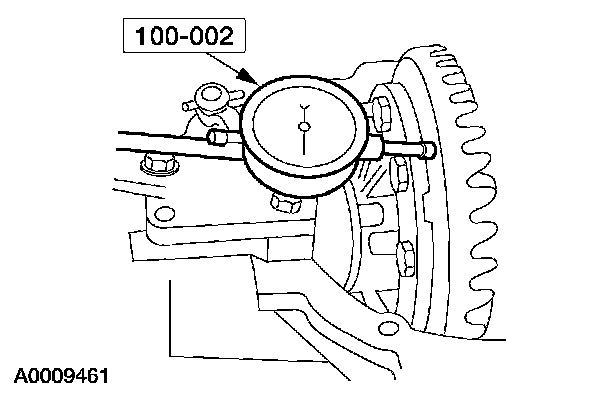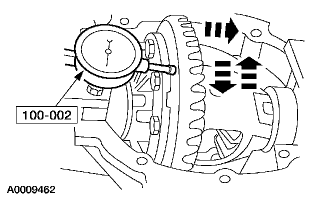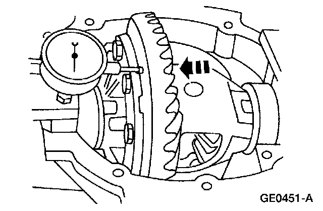 2 Force the differential case as far as possible away from the indicator. Position the indicator tip on the machined surface and adjust it to measure full travel. With force still applied, set the indicator to zero.