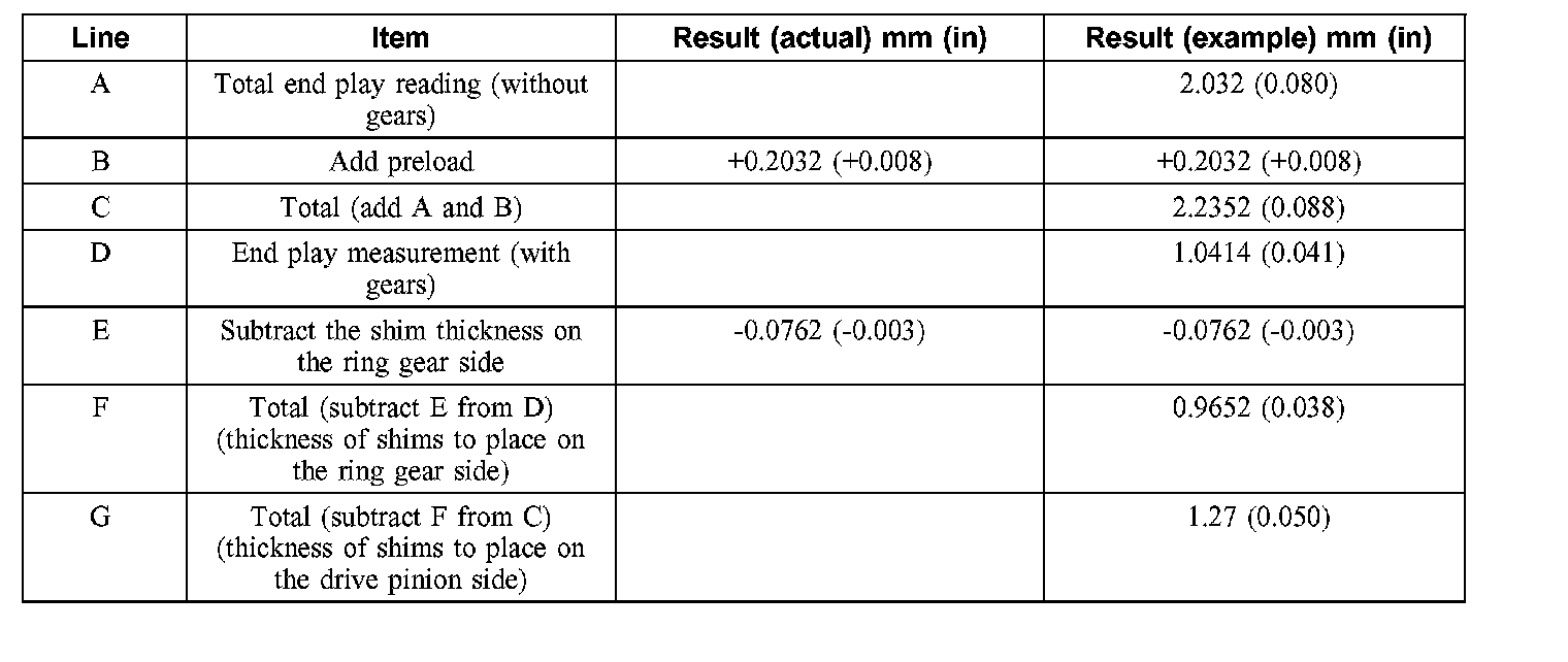 13. Complete the worksheet, and select the appropriate thickness differential shims. New differential shims are available in 0.0762 mm (0.003 inch), 0.127 mm (0.005 inch), 0.254 mm (0.010 inch), and 0.762 mm (0.030 inch) thickness.