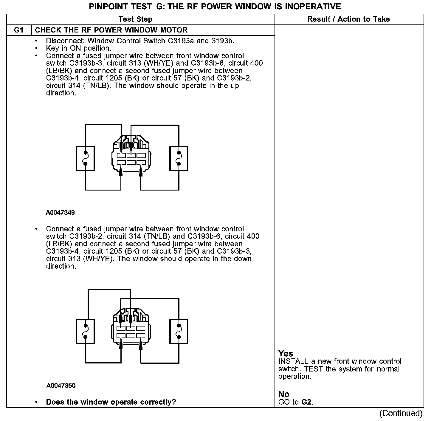 Under normal operation when the front window control switch is operated in the UP position the RF front motor receives power through circuit 313 (WH/YE) and ground through circuit 314 (TN/LB). When the front window control switch is operated in the DOWN position the RF front motor receives power through circuit 314 (TN/LB) and ground through circuit 313 (WH/YE).