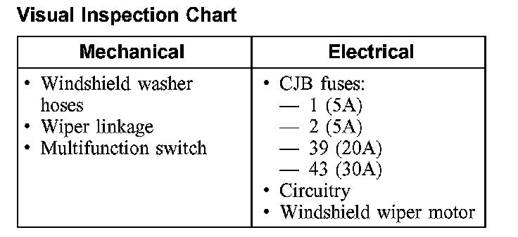 3. If an obvious cause for an observed or reported concern is found, correct the cause (if possible) before proceeding to the Symptom Chart. GO to Symptom Chart - Wipers and Washers. Testing and Inspection