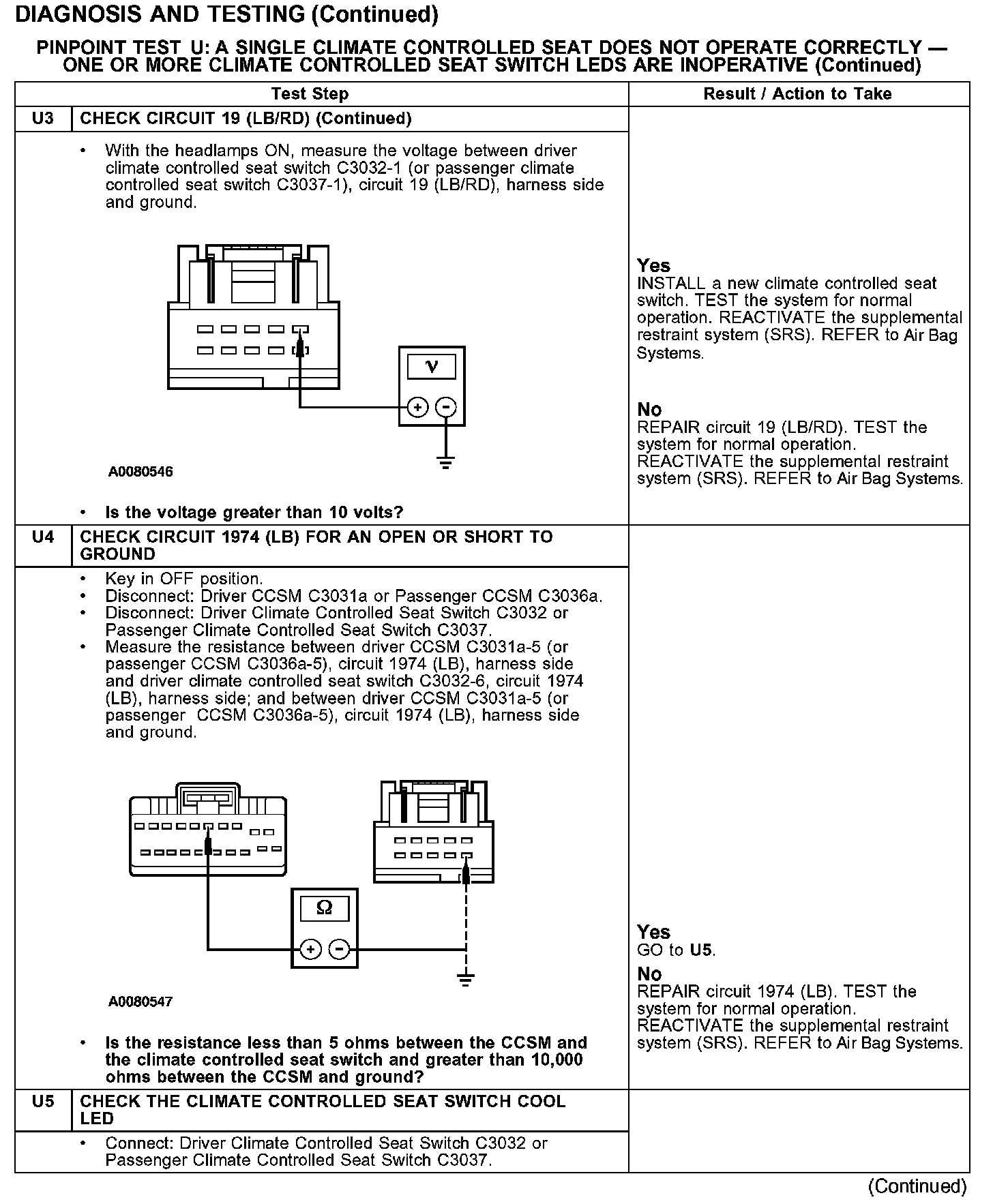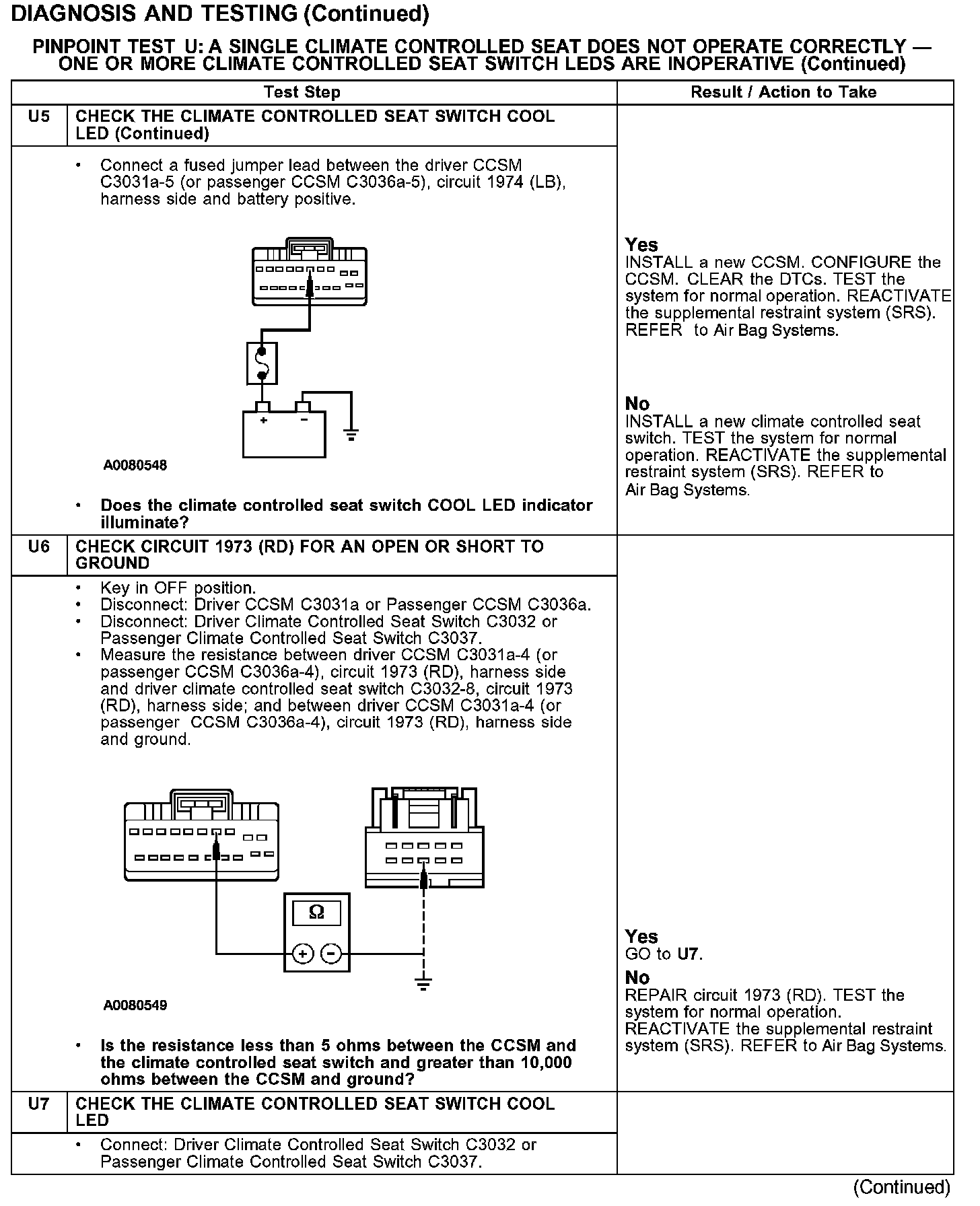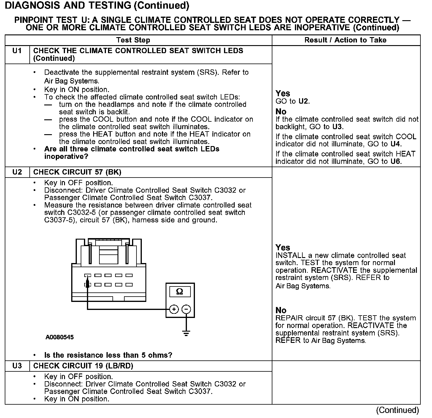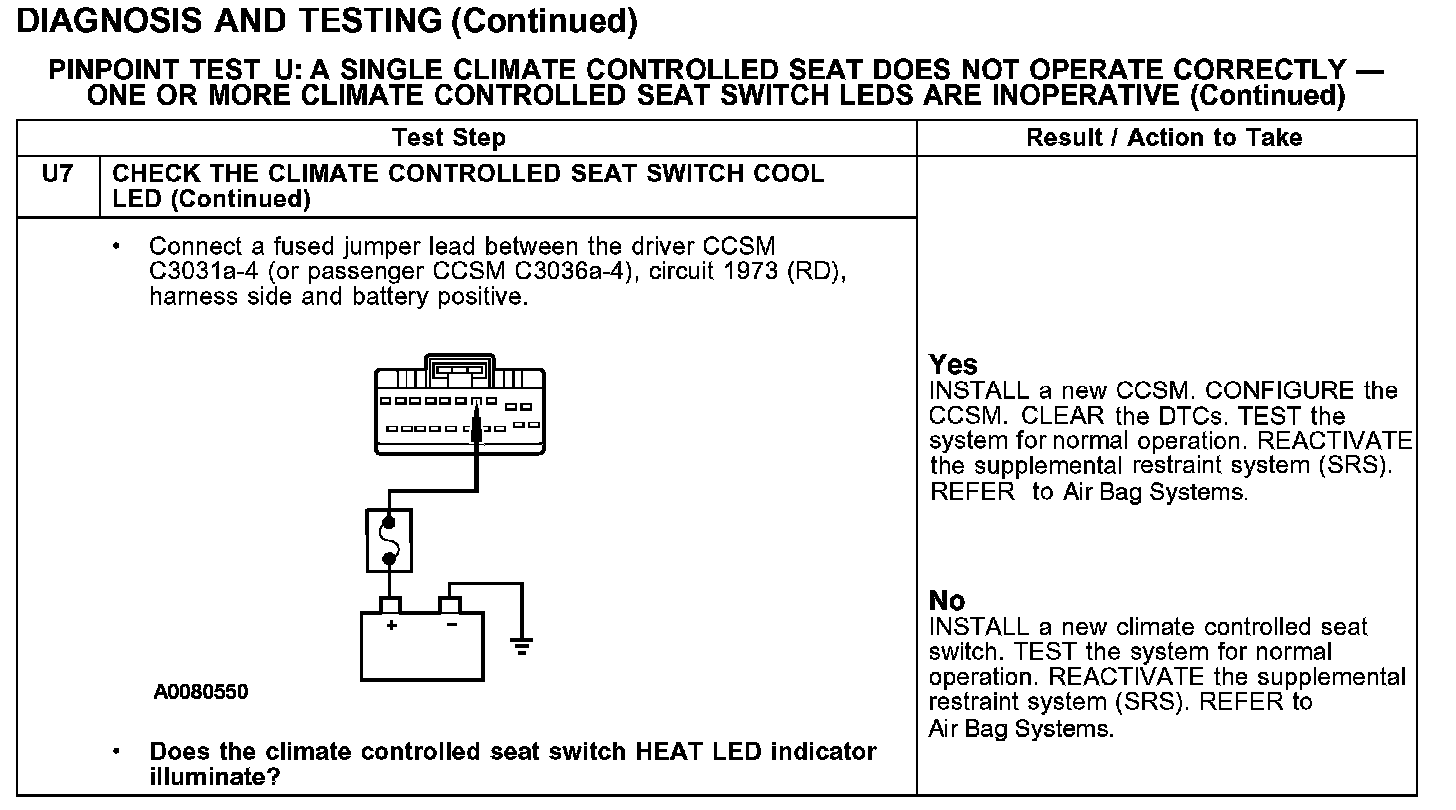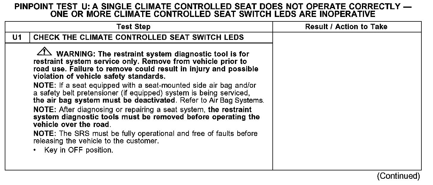 PINPOINT TEST U: A SINGLE CLIMATE CONTROLLED SEAT DOES NOT OPERATE CORRECTLY - ONE OR MORE CLIMATE CONTROLLED SEAT SWITCH LEDs ARE INOPERATIVE