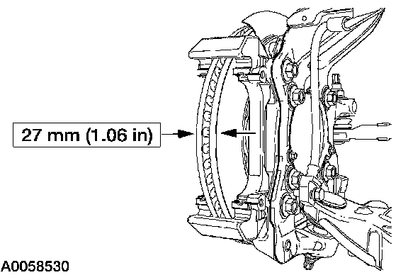 1. CAUTION: Install a new lining if worn to or past the specified thickness above the metal backing plate or rivets. Install new pads in complete axle sets.
