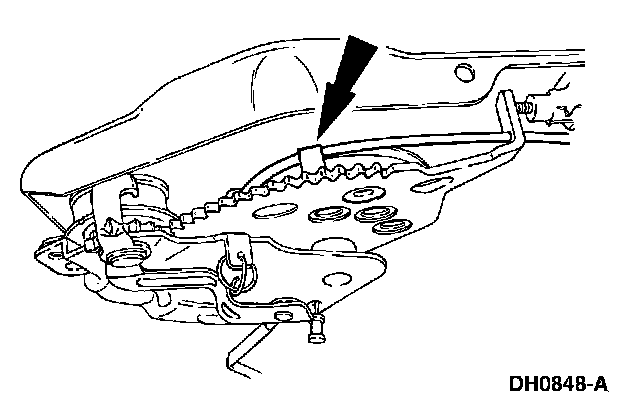 ^ While a helper pulls down on the front cable, insert a pin through the park brake control frame and cam.