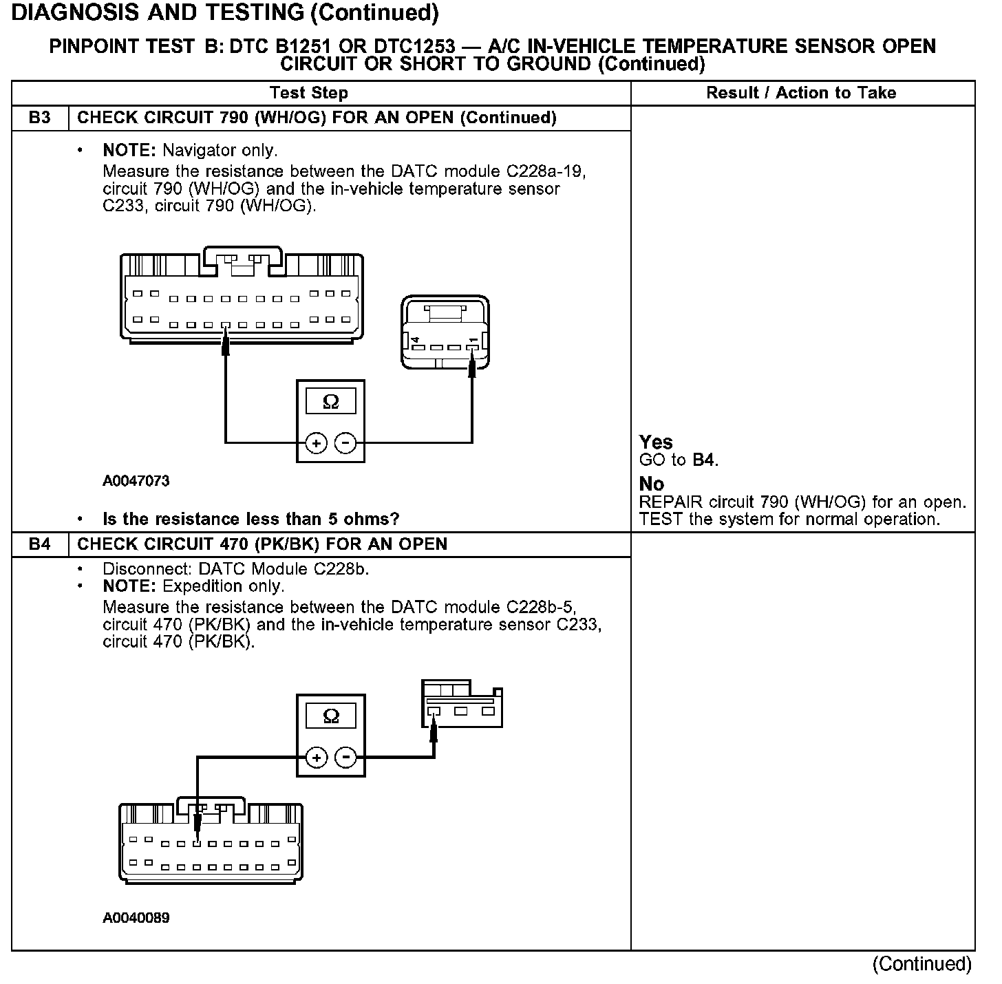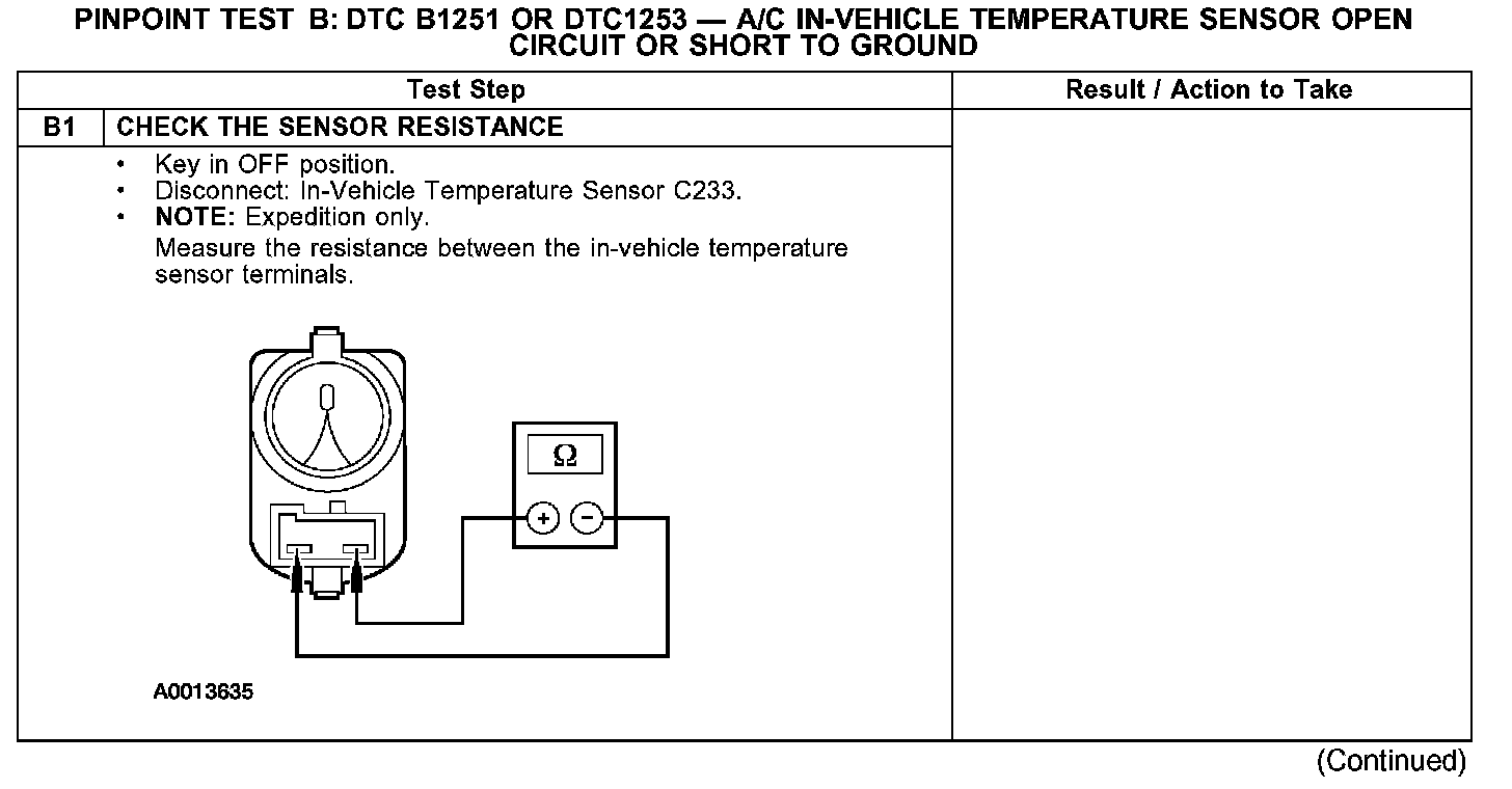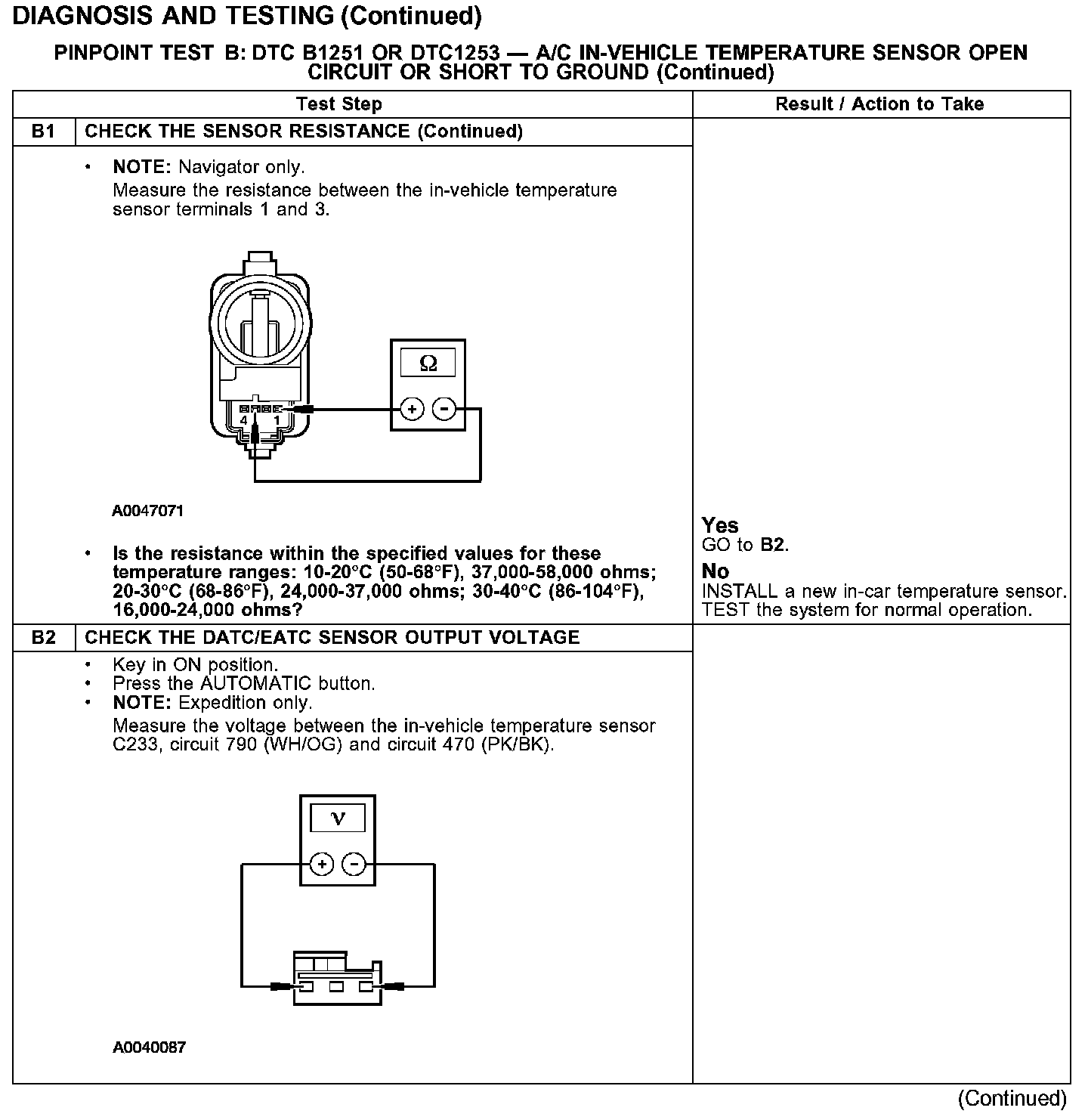 PINPOINT TEST B: DTC B1251 OR DTC1253 - A/C IN-VEHICLE TEMPERATURE SENSOR OPEN CIRCUIT OR SHORT TO GROUND