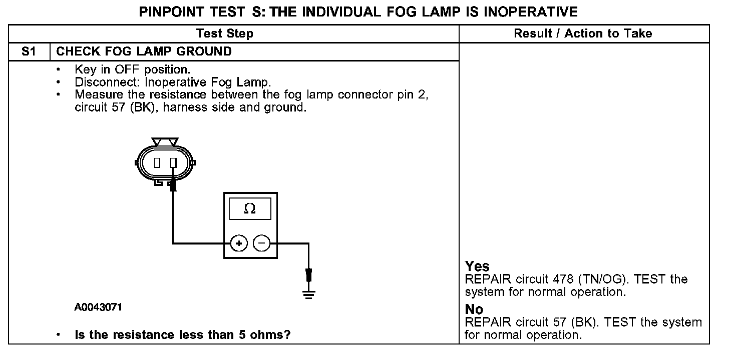 PINPOINT TEST S: THE INDIVIDUAL FOG LAMP IS INOPERATIVE