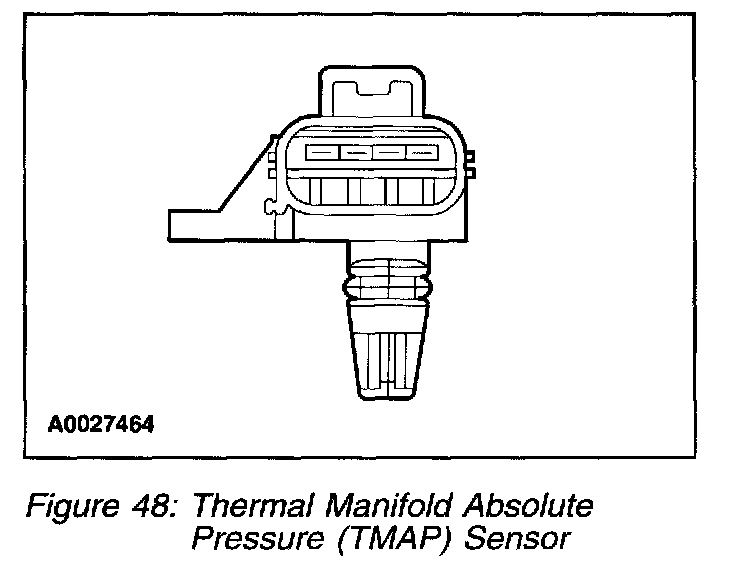 The Thermal Manifold Absolute Pressure Sensor (TMAP) (Figure 48) consists of a manifold absolute pressure (MAP) sensor and an integrated thermistor. The MAP portion of the sensor uses a piezo-resistive silicon sensing element to provide a voltage proportional to the absolute pressure in the intake manifold. The thermistor portion of the sensor operates in the same manner as an intake air temperature (IAT) sensor. For additional information on how the IAT sensor operates, refer to the Intake Air Temperature Sensor description and operation.