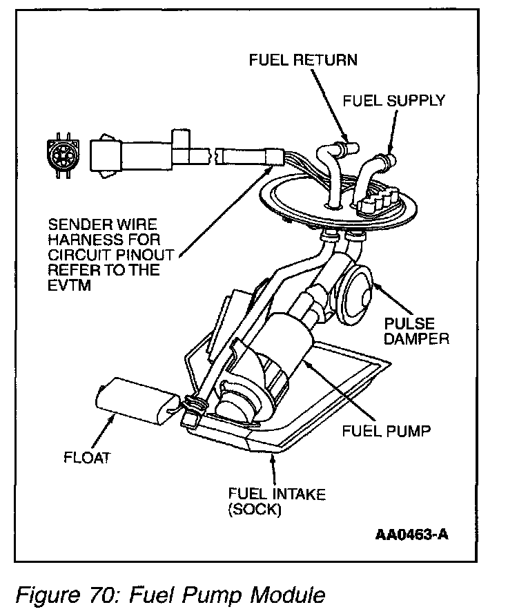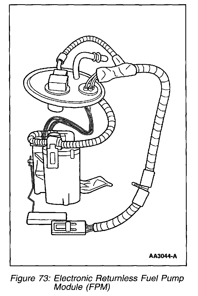 The fuel pump (FP) module (Figure 71),(Figure 72) and(Figure 73) is a device that contains the fuel pump and sender assembly. The fuel pump is located inside the FP module reservoir and supplies fuel through the FP module manifold to the engine and FP module jet pump. The jet pump continuously refills the reservoir with fuel, and a check valve located in the manifold outlet maintains system pressure when the fuel pump is not energized. A flapper valve located in the bottom of the reservoir allows fuel to enter the reservoir and prime the fuel pump during the initial fill.