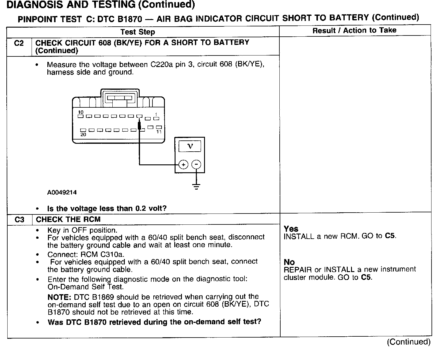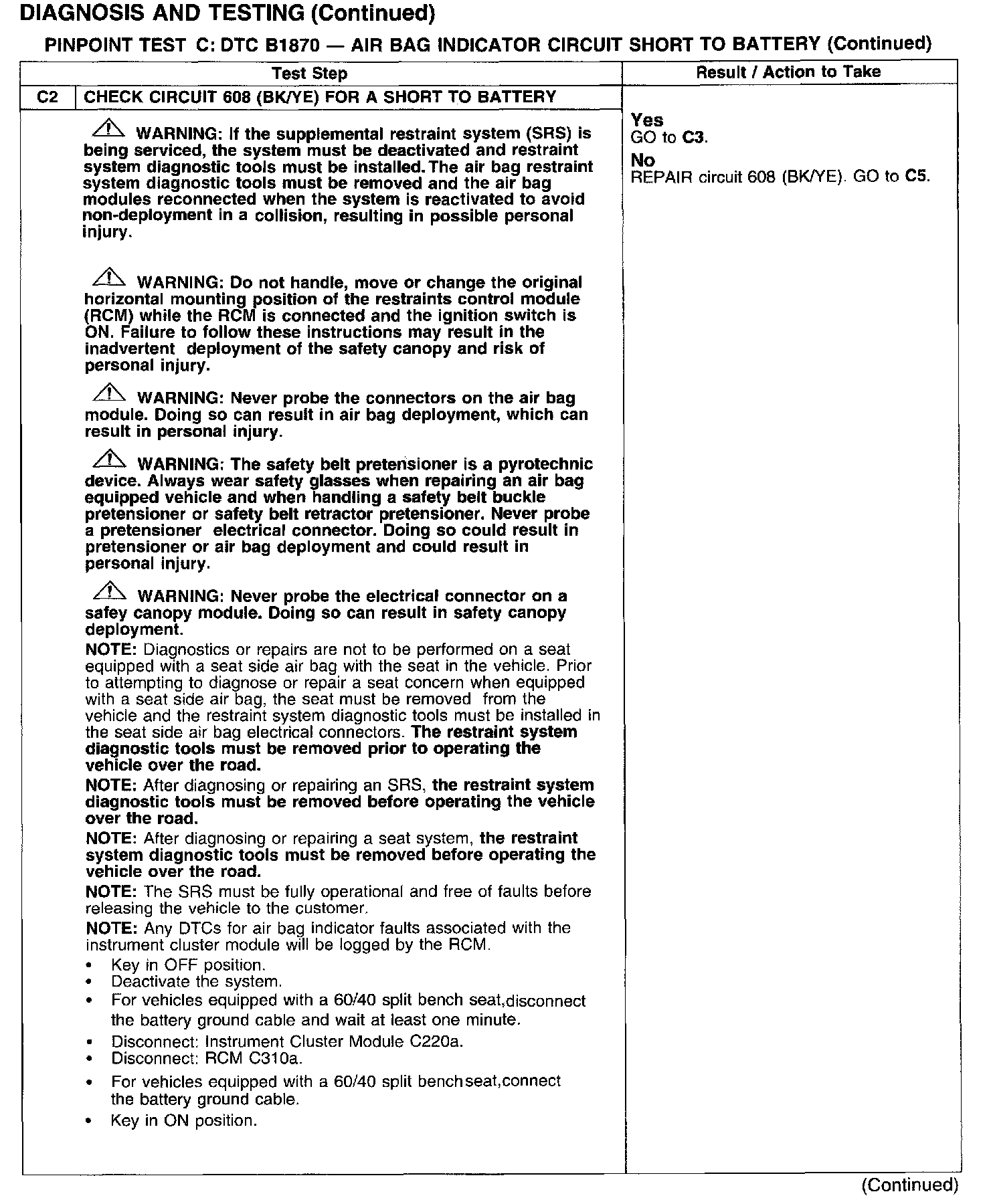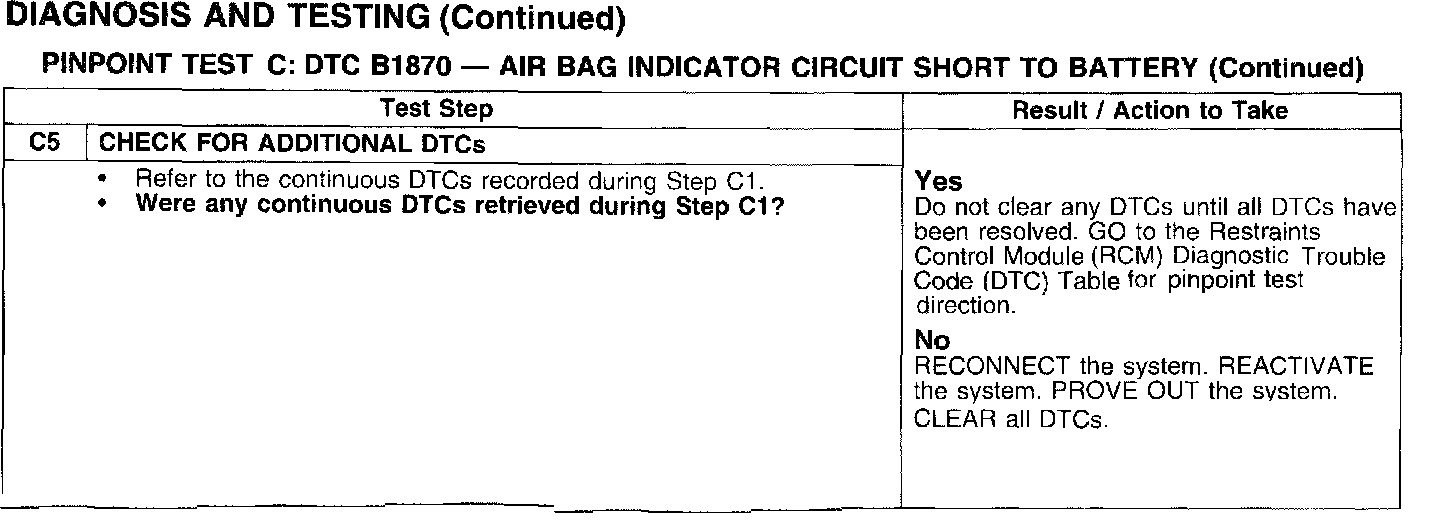 PINPOINT TEST C: DTC B1870 - AIR BAG WARNING INDICATOR CIRCUIT SHORT TO BATTERYTest C1: