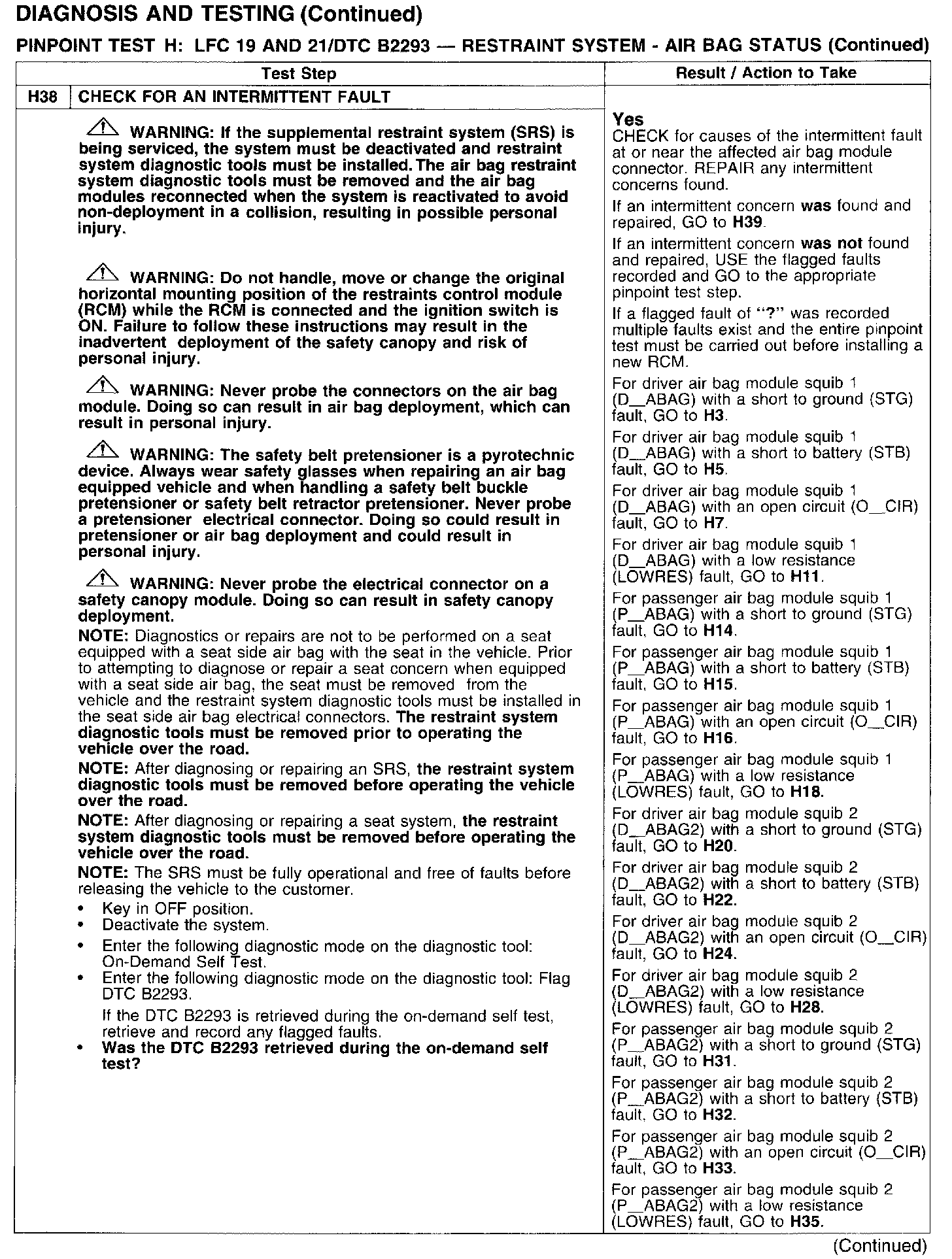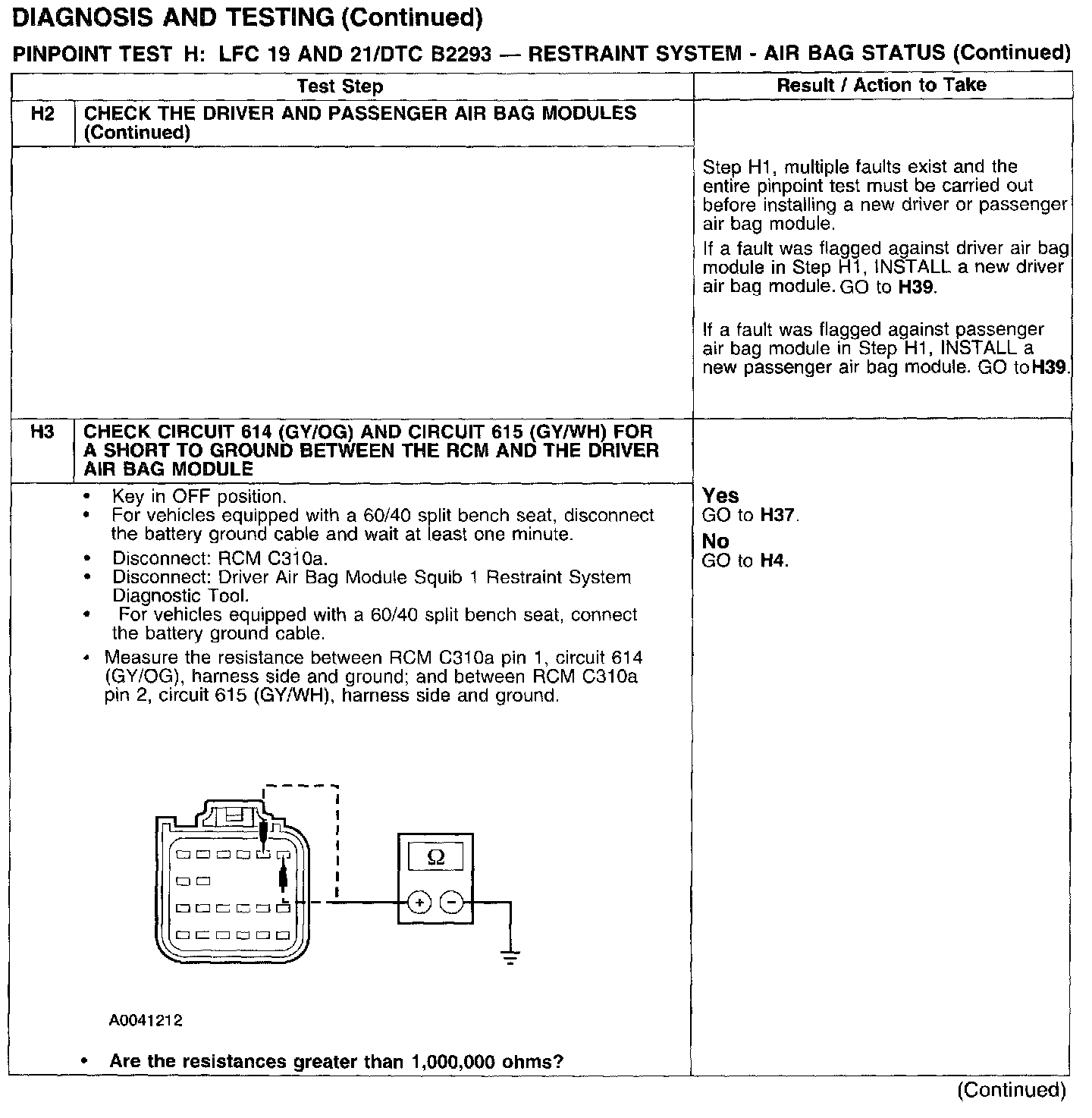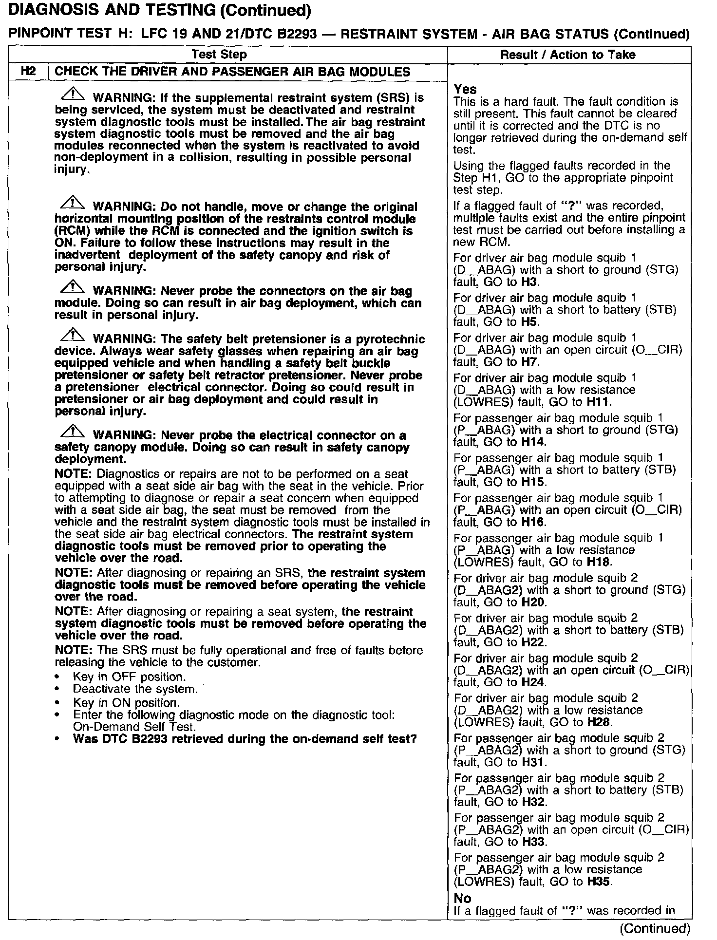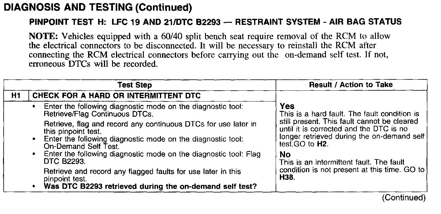 PINPOINT TEST H: LFC 19 AND 21/DTC B2293 - RESTRAINT SYSTEM - AIRBAG STATUSTest H1: