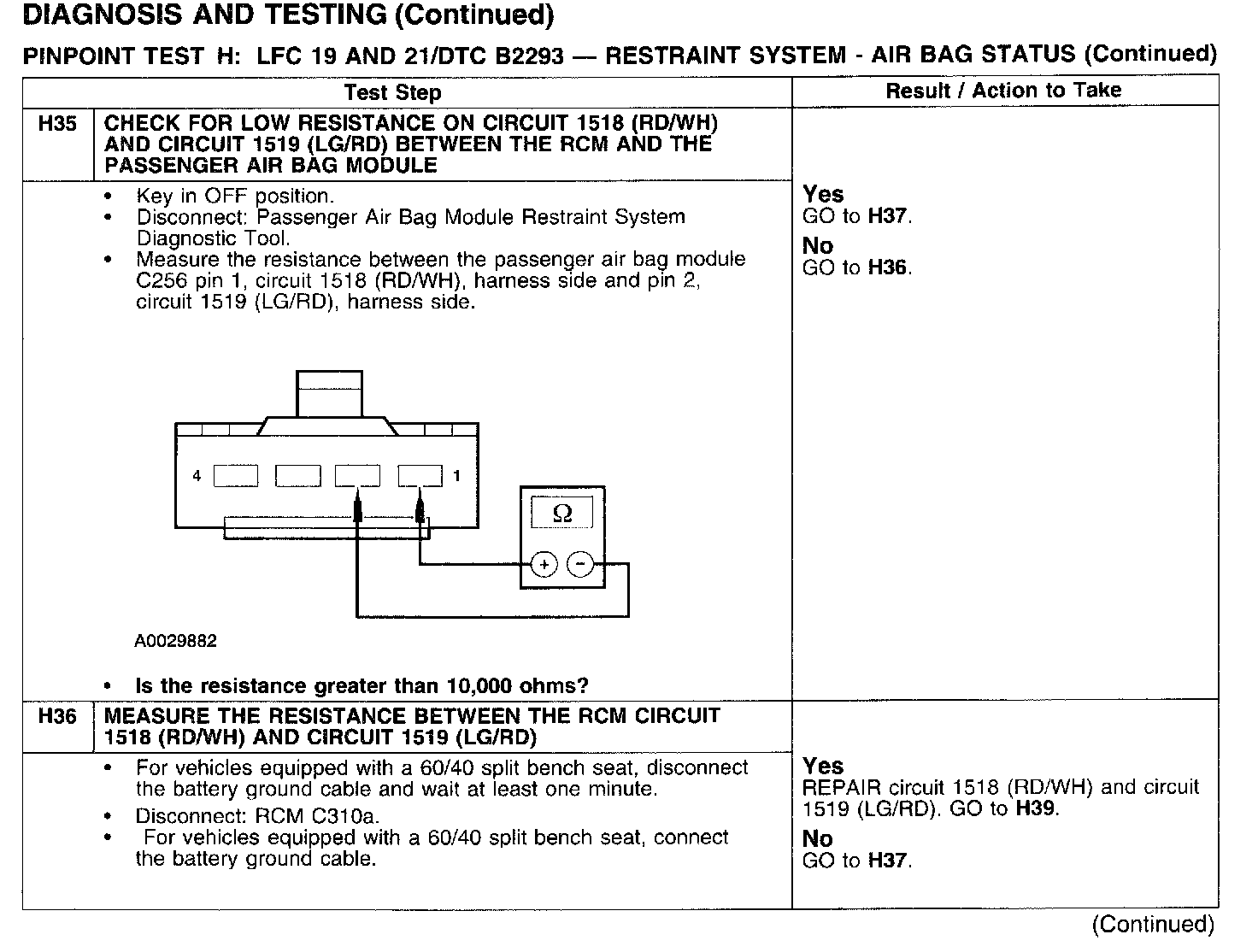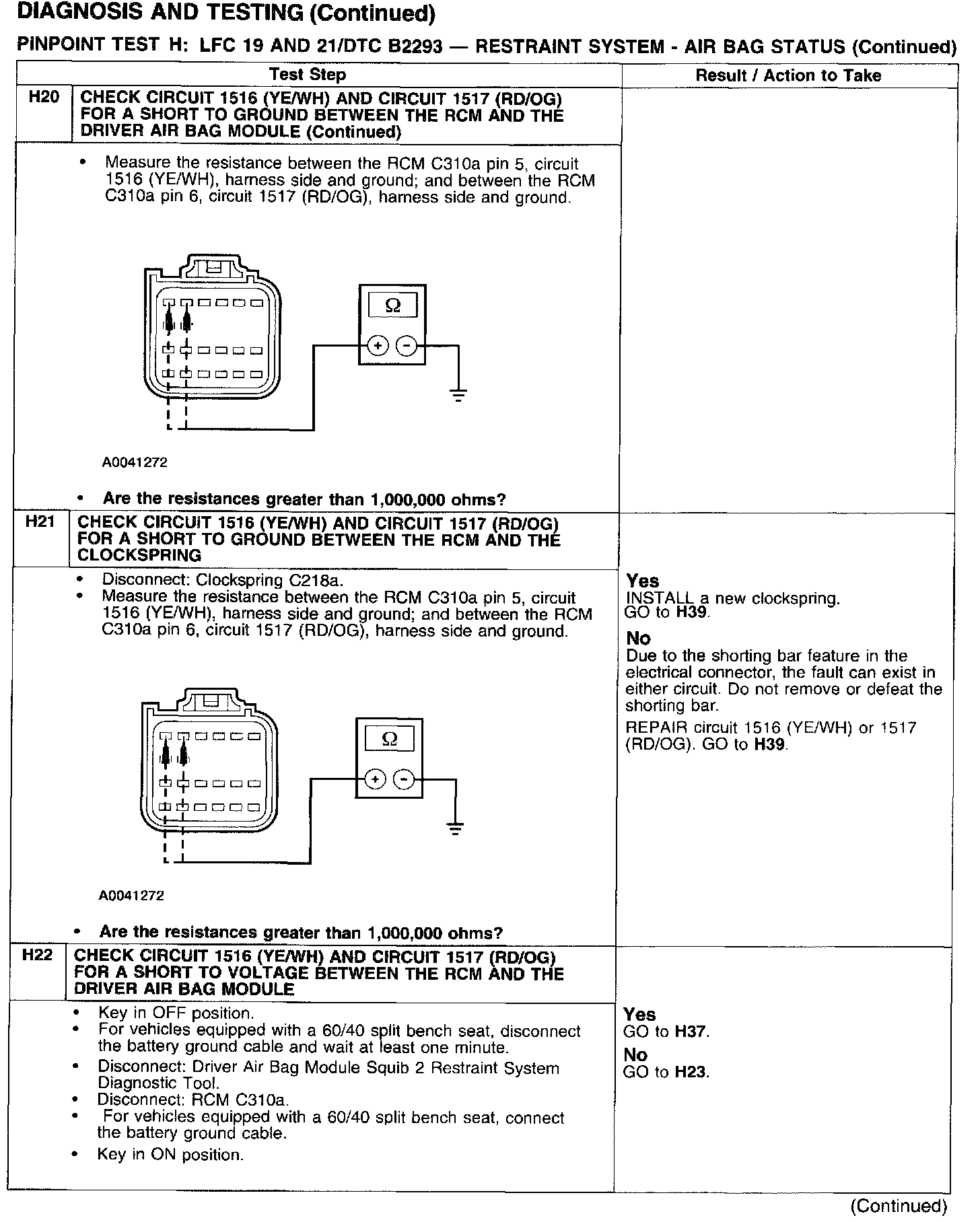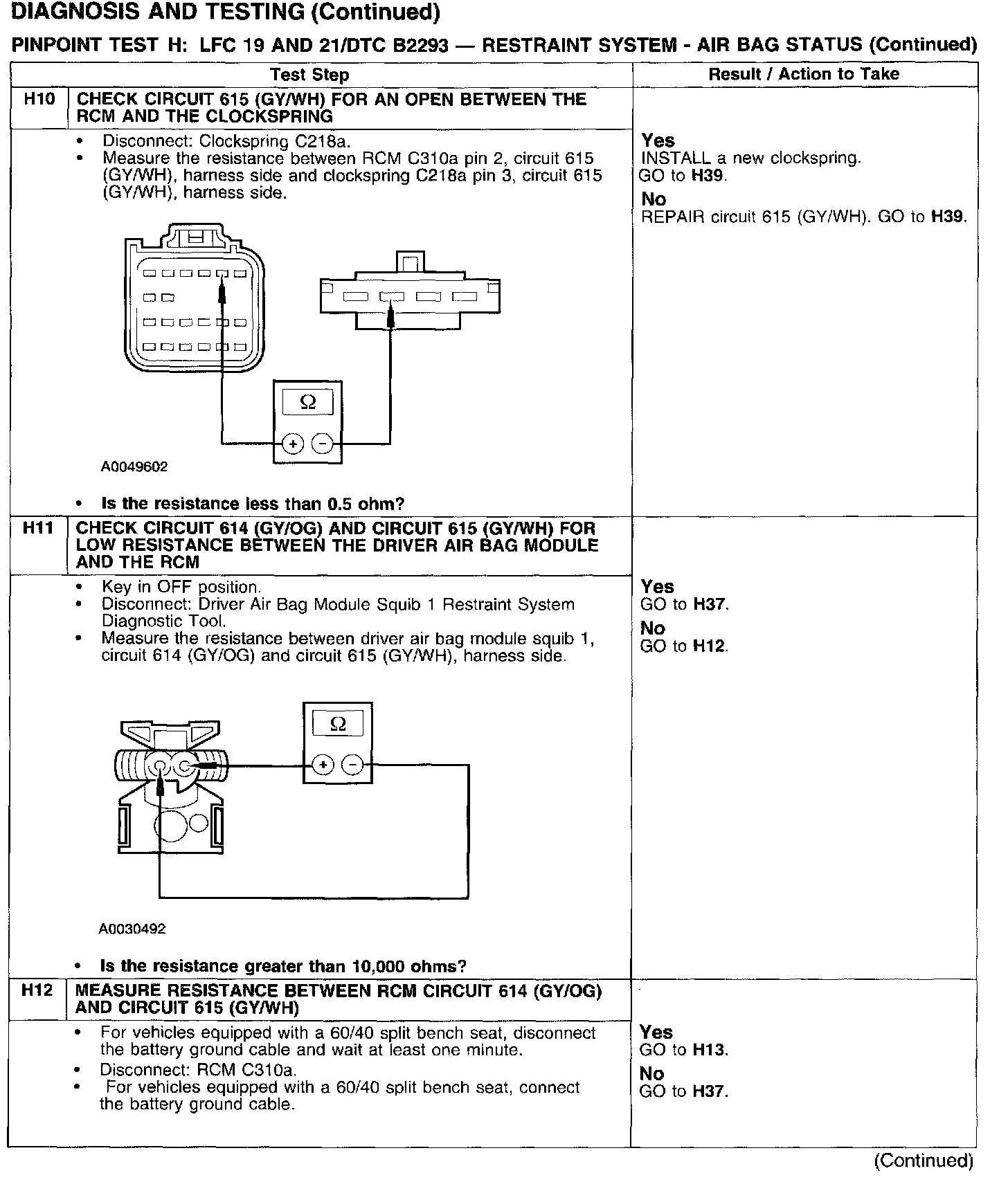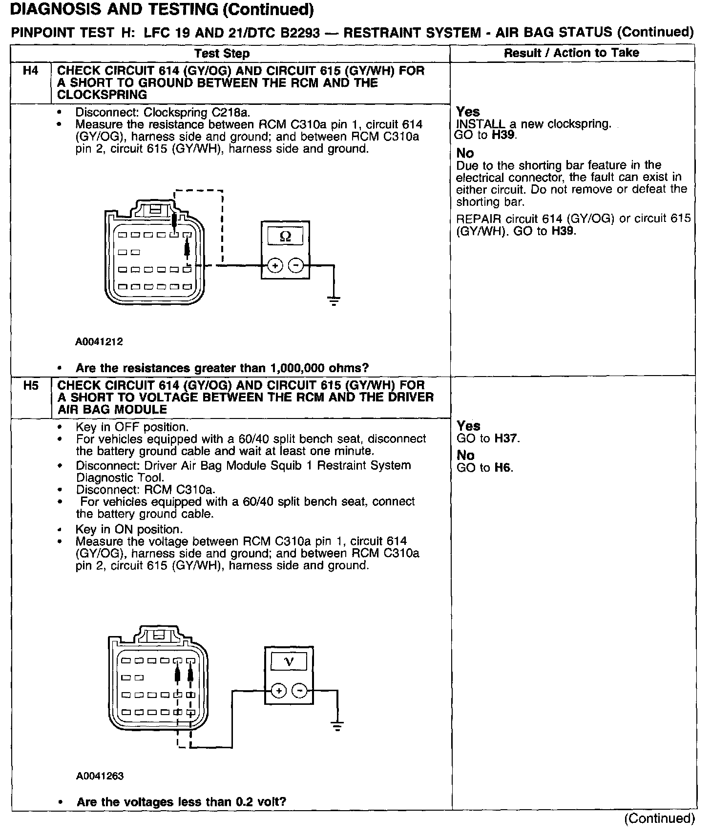 PINPOINT TEST H: LFC 19 AND 21/DTC B2293 - RESTRAINT SYSTEM - AIRBAG STATUSTest H1: