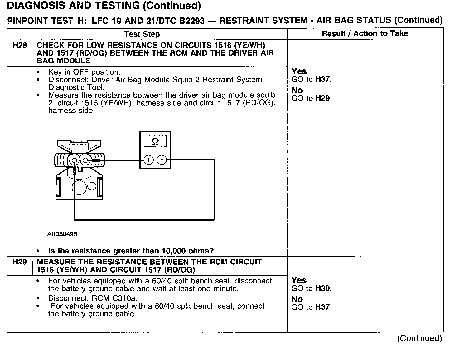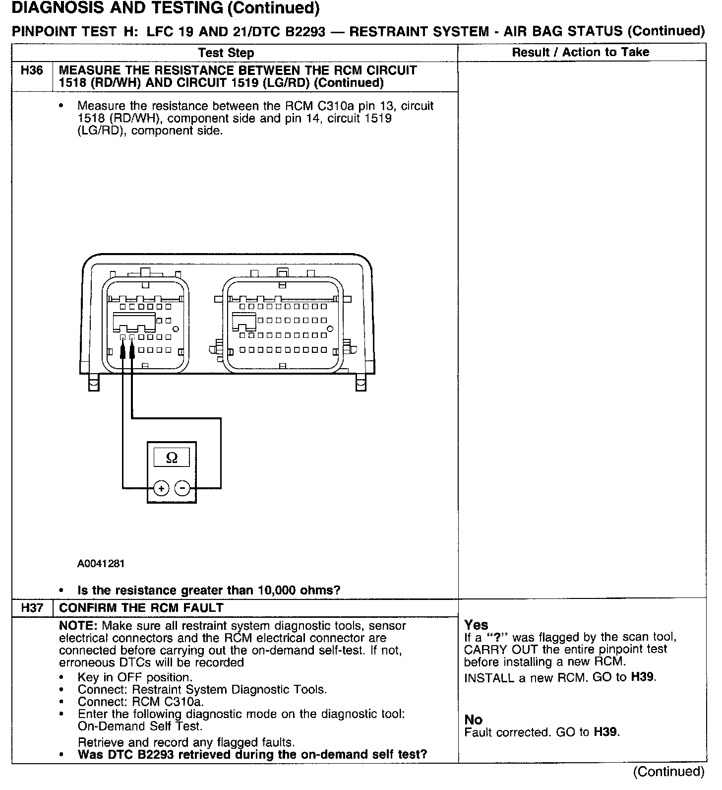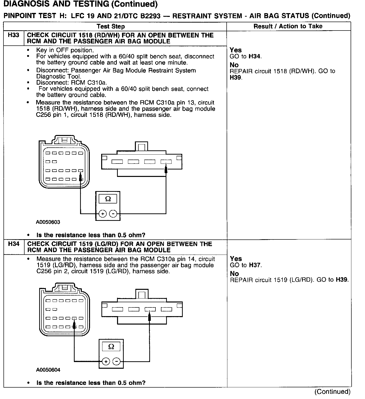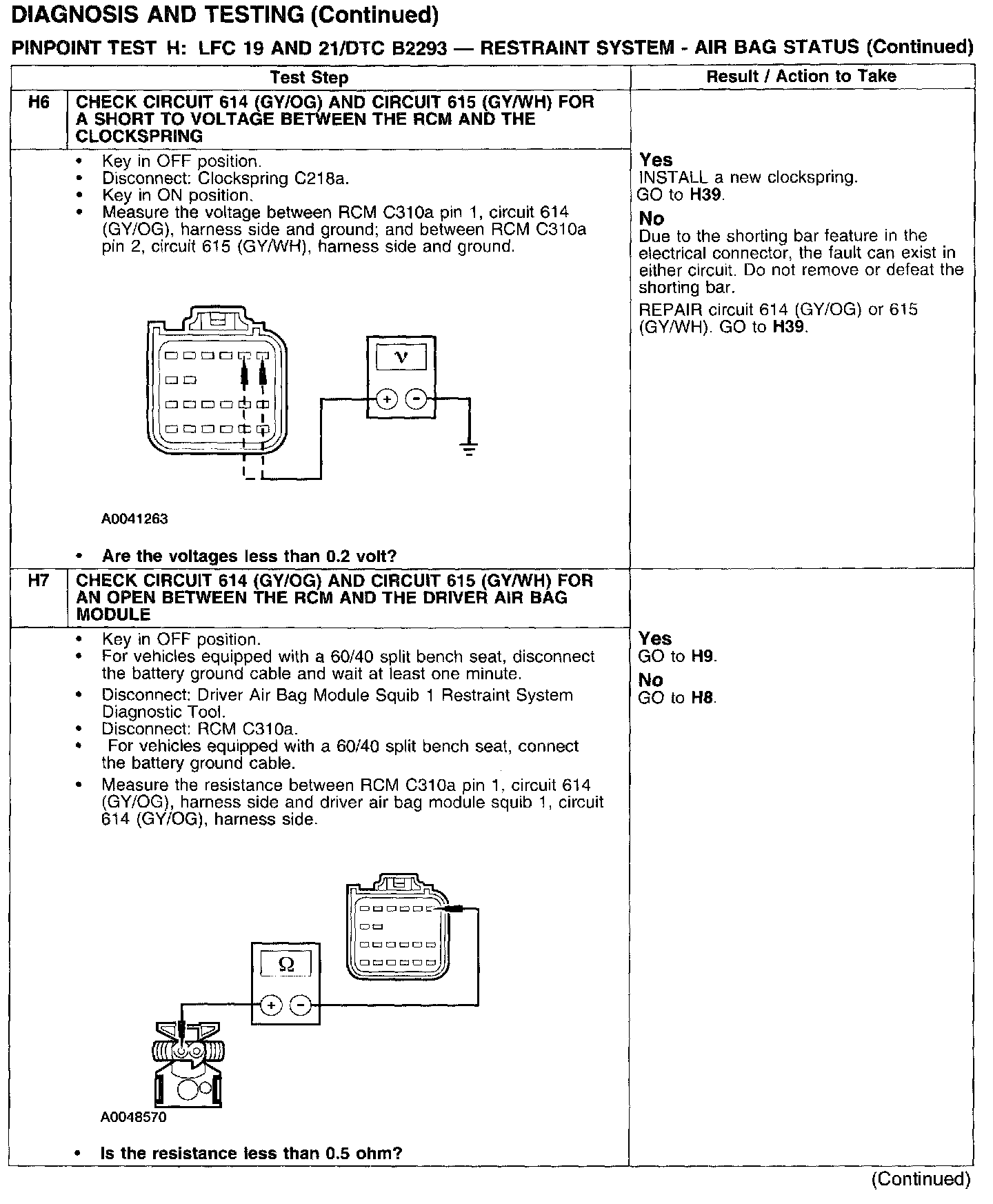PINPOINT TEST H: LFC 19 AND 21/DTC B2293 - RESTRAINT SYSTEM - AIRBAG STATUSTest H1: