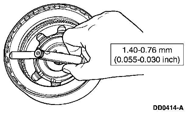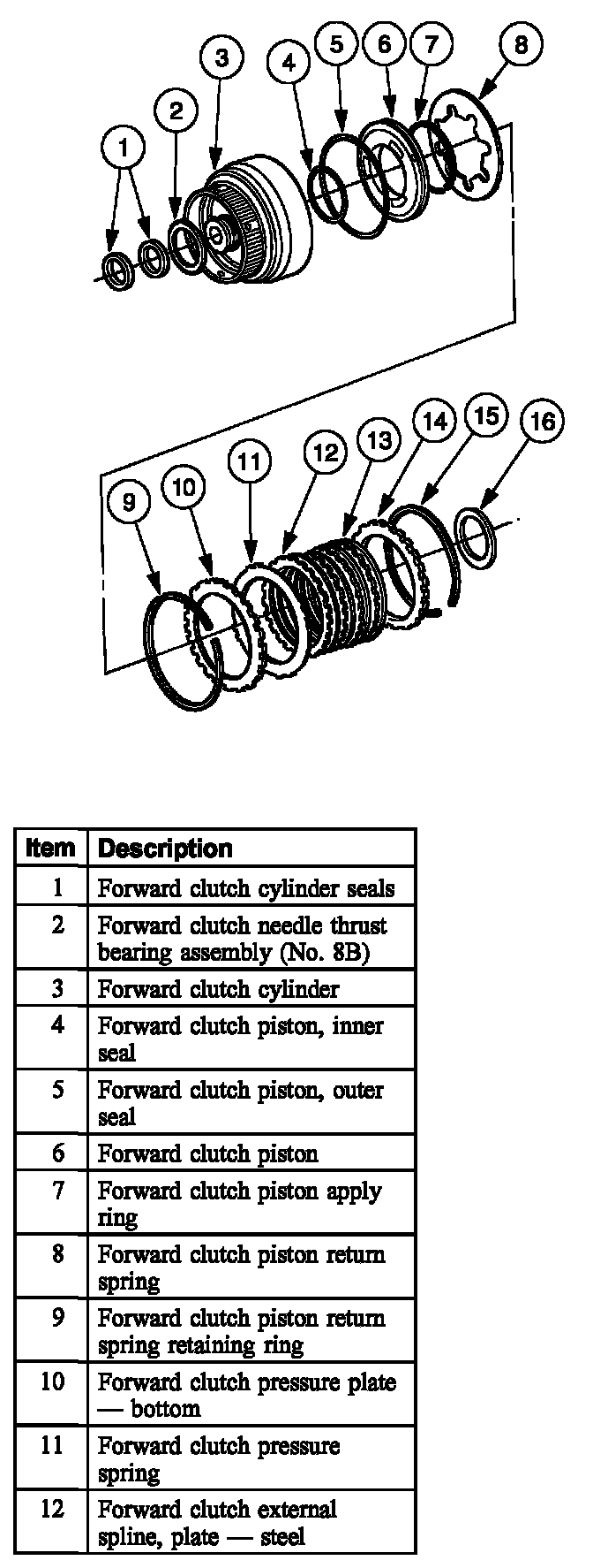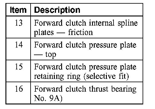 ^ If the clearance is not to specification, install the correct selective forward clutch pressure plate retaining ring and recheck the clearance. Refer to the Clutch Plate Usage and Clearance Specification Chart for selective snap ring thicknesses and part numbers.
