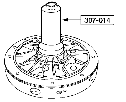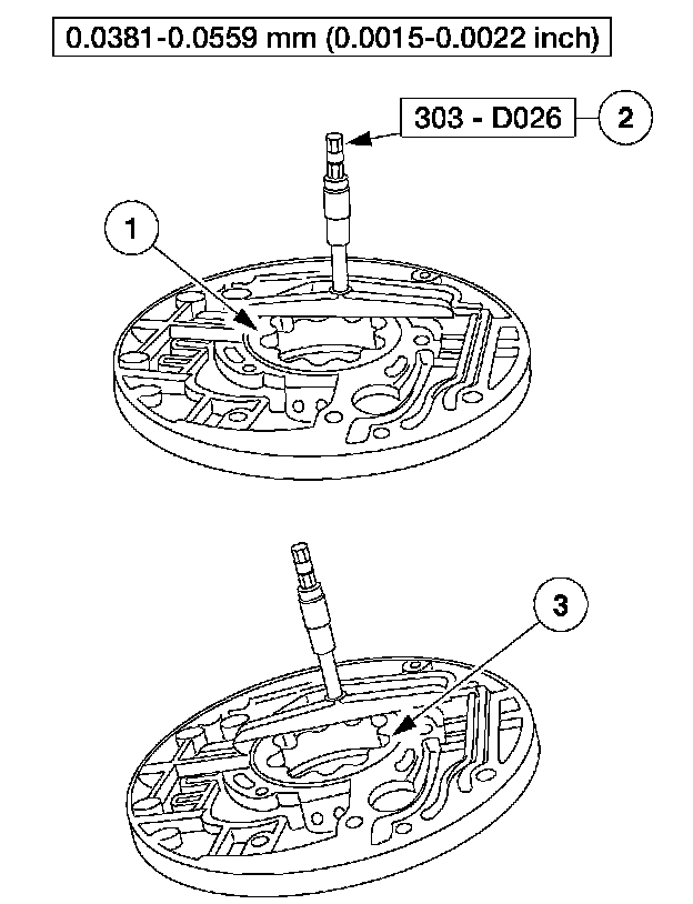 2 Using the special tool, measure and record the depth of the inner gerotor gear face to the pump body machined surface. Repeat measurement for a total of three readings in equally spaced locations on the gear face. If the reading is not within specification, install a new front pump assembly.