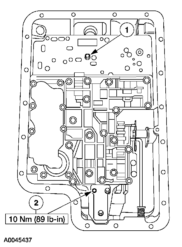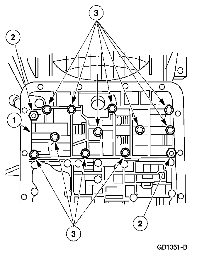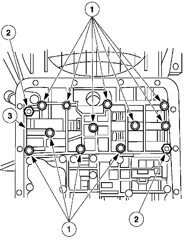 11. Tighten all the accumulator body, main control valve body, and solenoid body nuts and bolts. Tighten the bolts, working from the center to the outside.