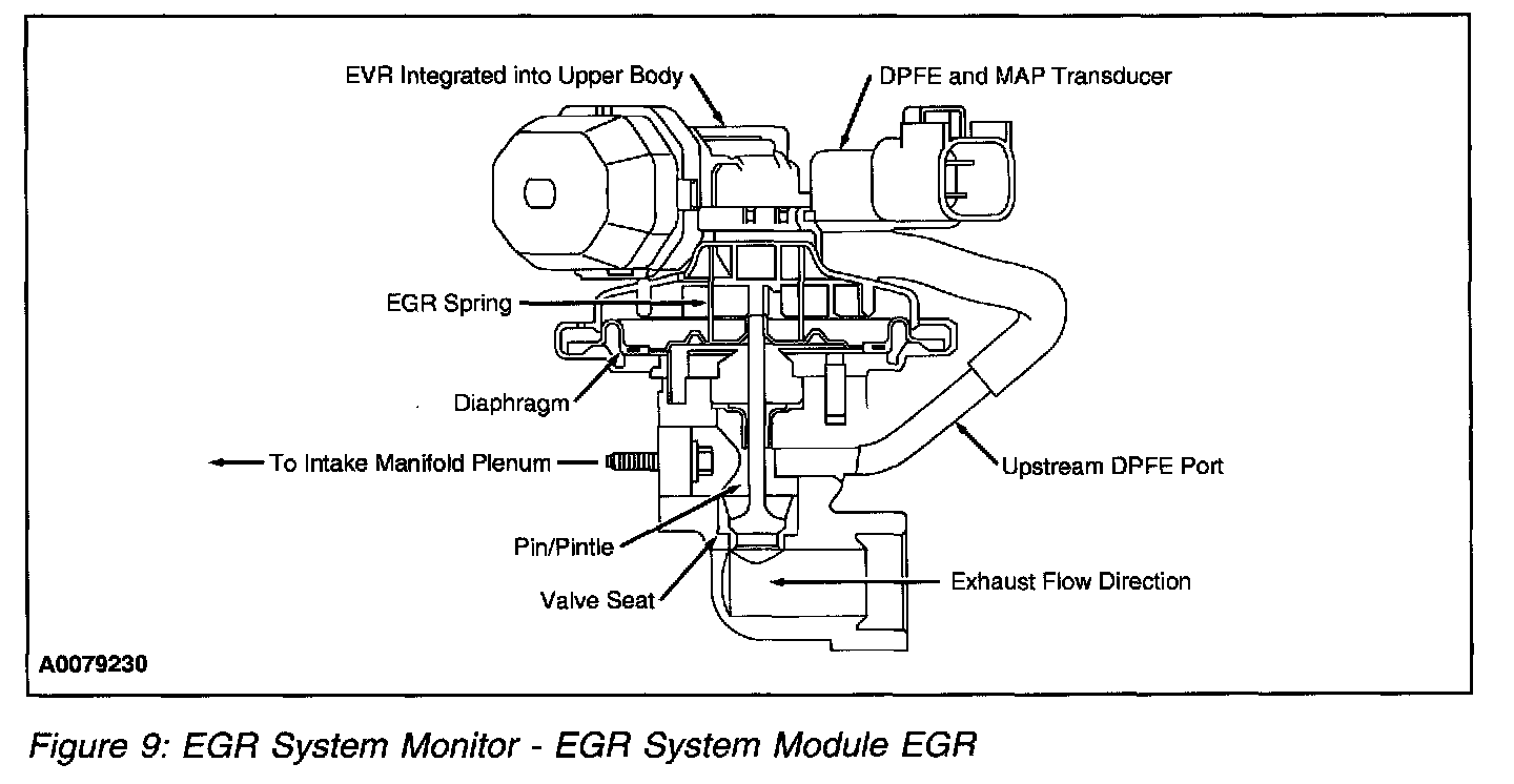 5. The EGR flow rate test is performed during a steady state when engine speed and load are moderate and EVR duty cycle is high. The monitor compares the actual DPFE circuit voltage to a desired EGR flow voltage for that state to determine if EGR flow rate is acceptable or insufficient. This is a system test and may trigger a DTC for any fault causing the EGR system to fail.