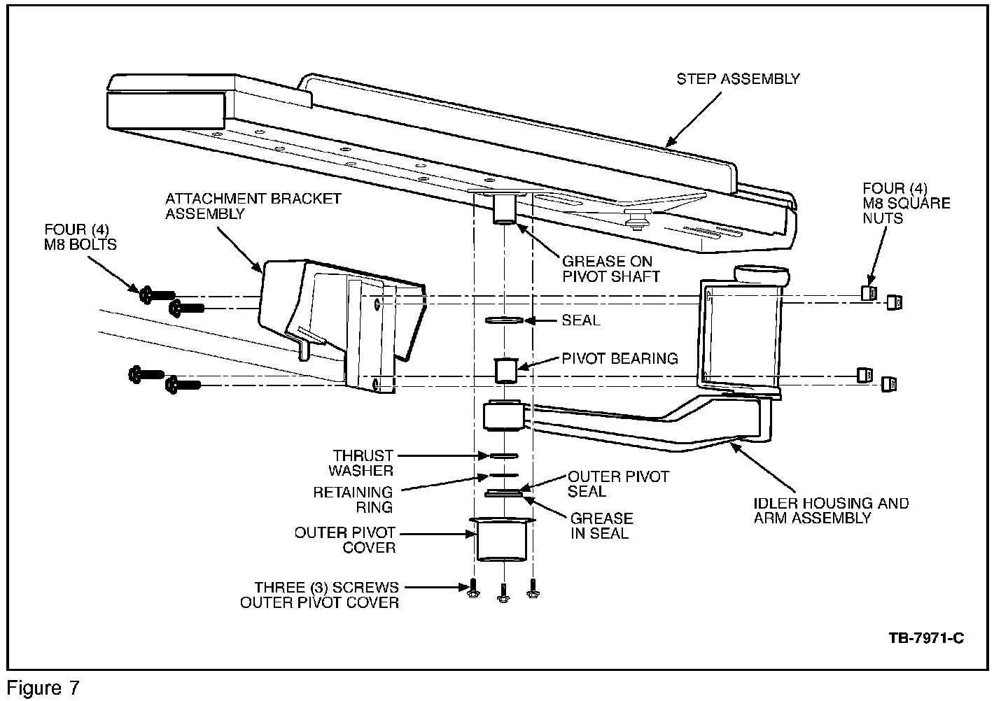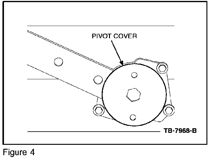 6. Before installing the new drive and idler unit, be sure that the seal is present and in the proper orientation, that the bushing is present in the pivot bearing, and that the outer pivot shaft is greased. (See Figure 7 for reference)