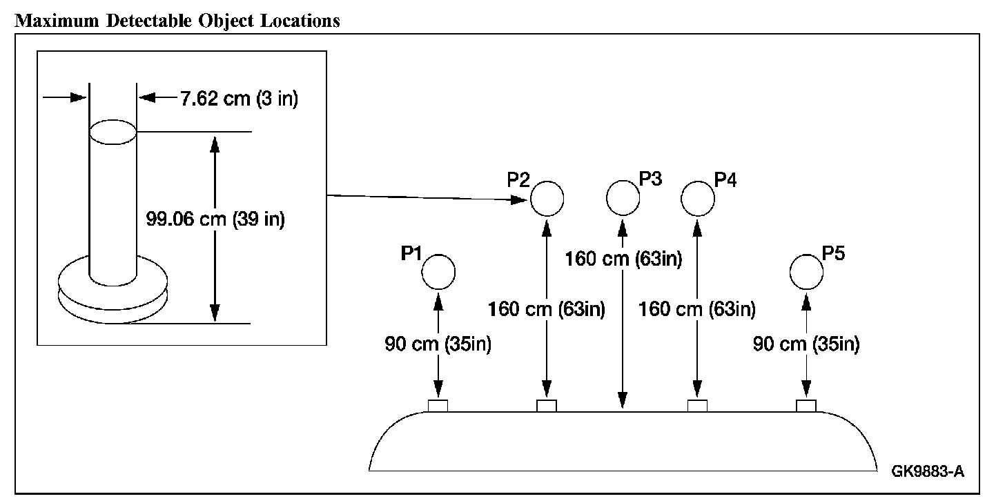 4. Verify that the parking aid system detects the specified object when placed in the 5 specified locations (P1, P2, P3, P4, P5).