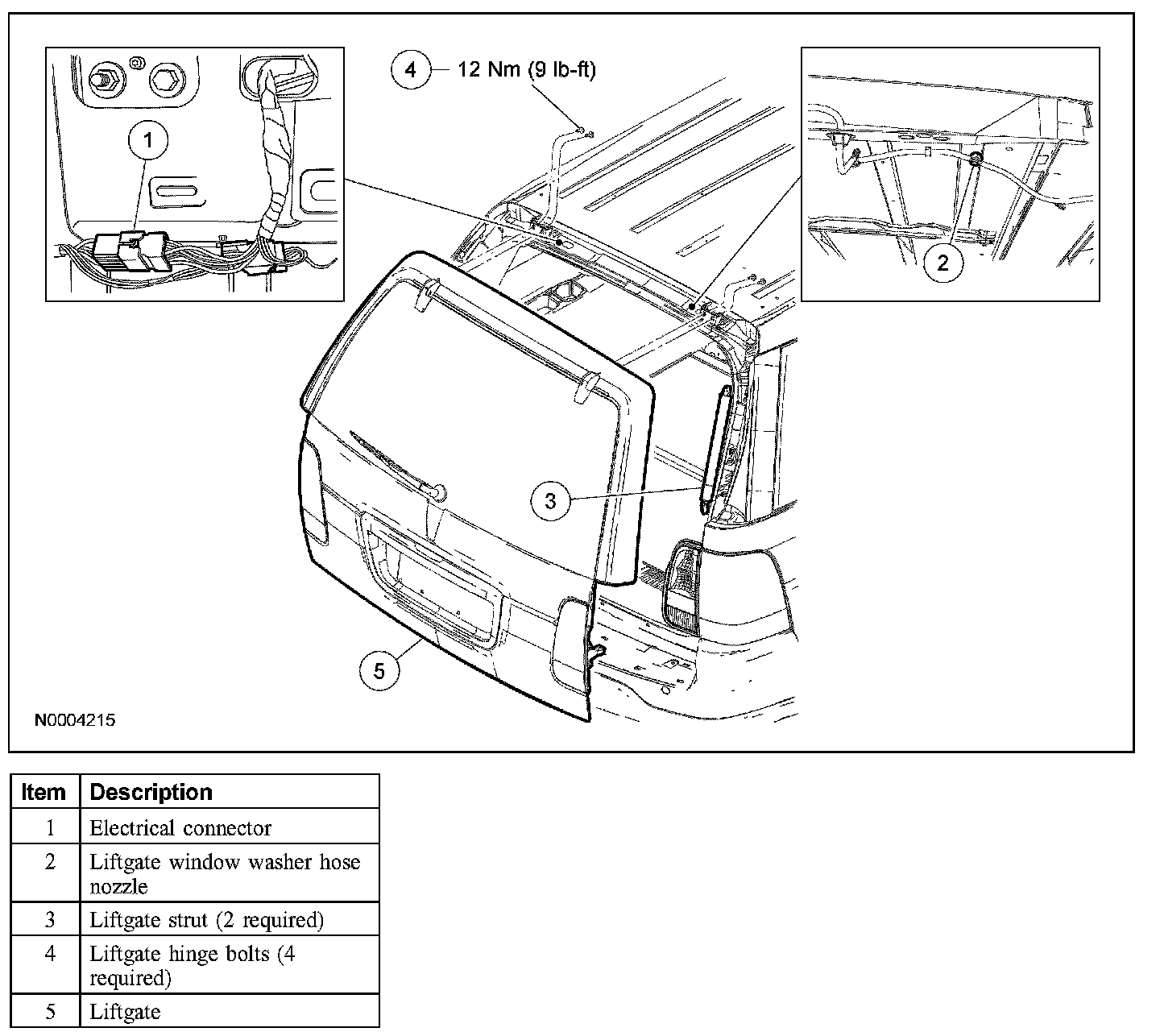 Remove the liftgate-to-hinge bolts and the liftgate.