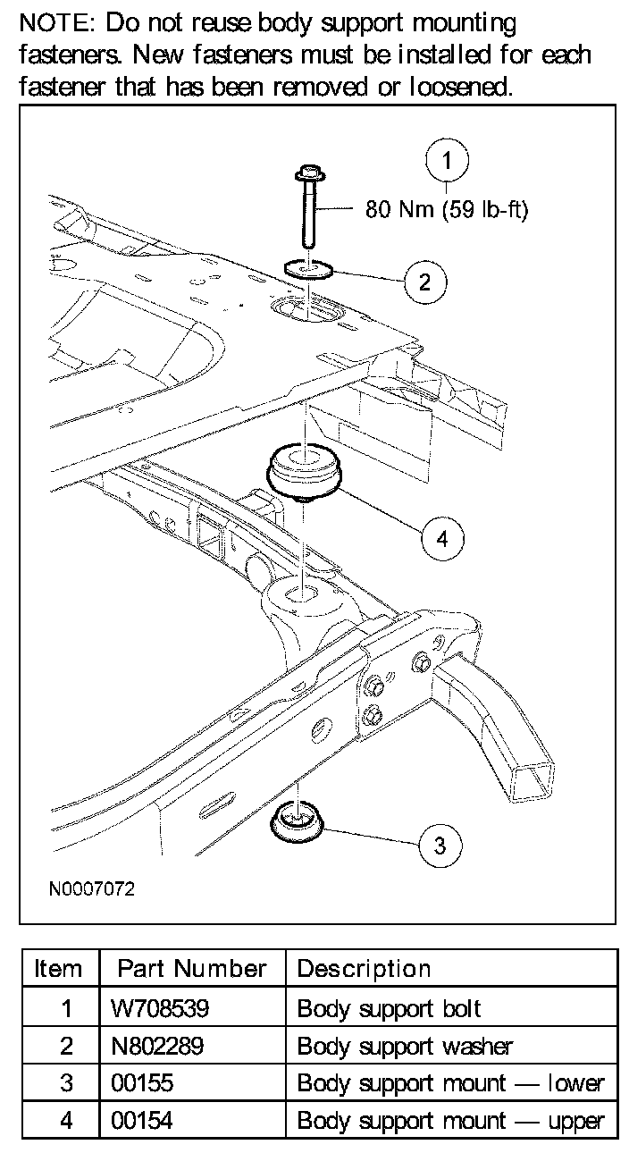 - Do not reuse body support mounting fasteners. New fasteners must be installed for each fastener that has been removed or loosened.