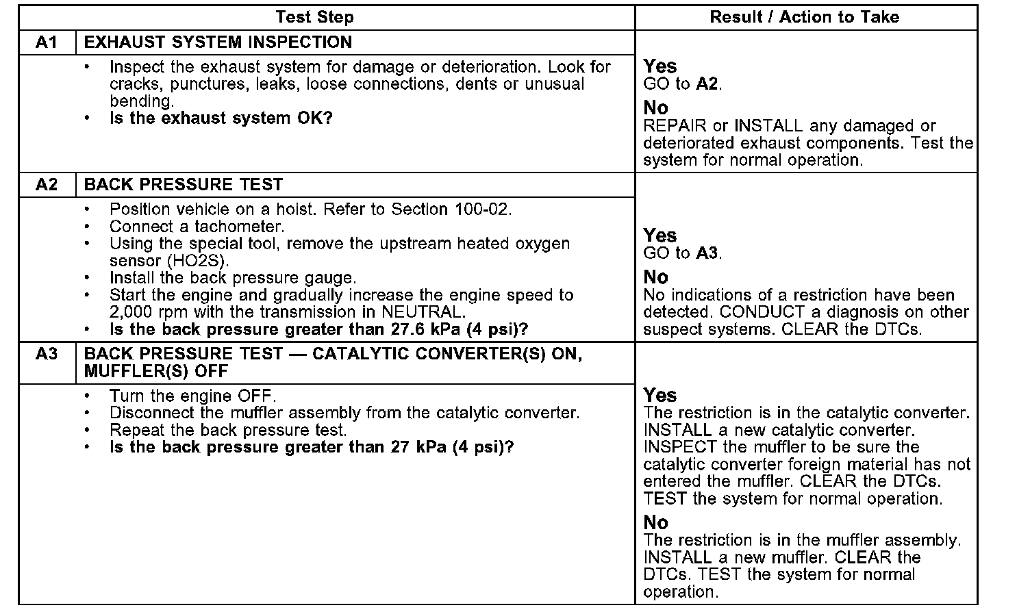 PINPOINT TEST A: RESTRICTED EXHAUST SYSTEM TESTNOTE: The vehicle can have a lack/loss of power, odor, a noise or a "no start" concern. These concerns may be related to the exhaust system. Carry out the following test, if no trouble codes were stored. This test is for diagnosing the source for these conditions.