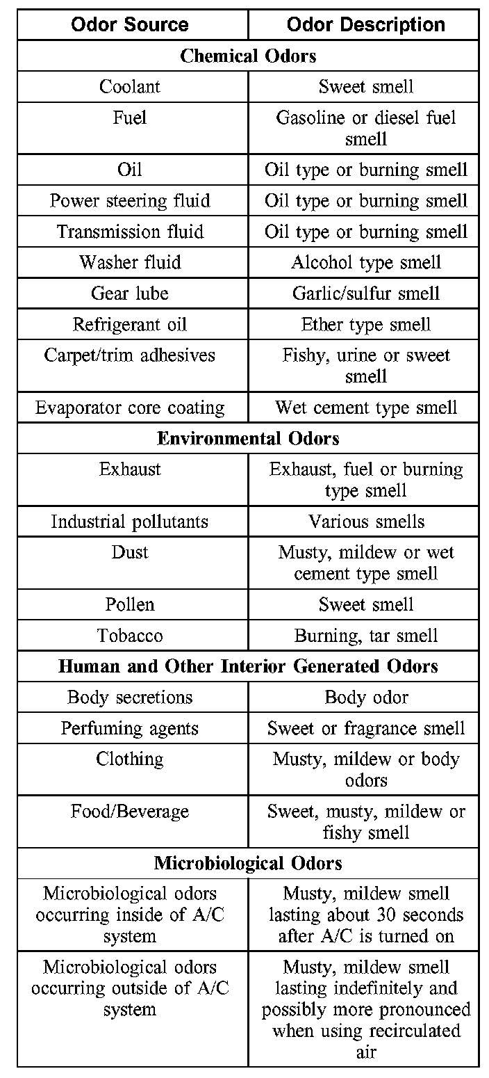1. Identify the type of odor present in the vehicle. Do not proceed with A/C odor treatment if the odor source is found to be outside of the A/C system. Refer to the chart for examples.