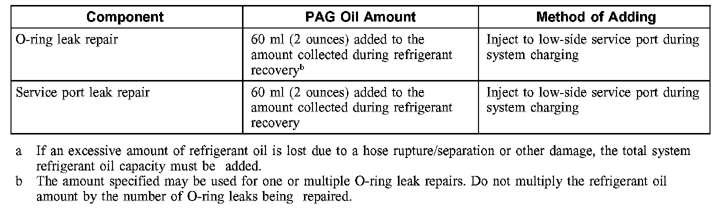 CAUTION: During normal A/C operation, oil is circulated through the system with the refrigerant, and a small amount is retained in each component. If certain components of the system are removed, some of the refrigerant oil will go with the component. To maintain the original total oil charge, it is necessary to compensate for the oil lost by adding oil to the system with the new part.