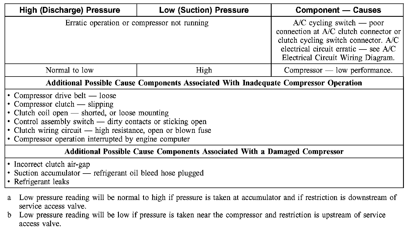 1. NOTE: The table is used to guide diagnosis of the refrigerant system if operating pressures are outside normal limits.