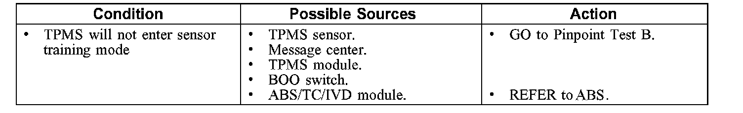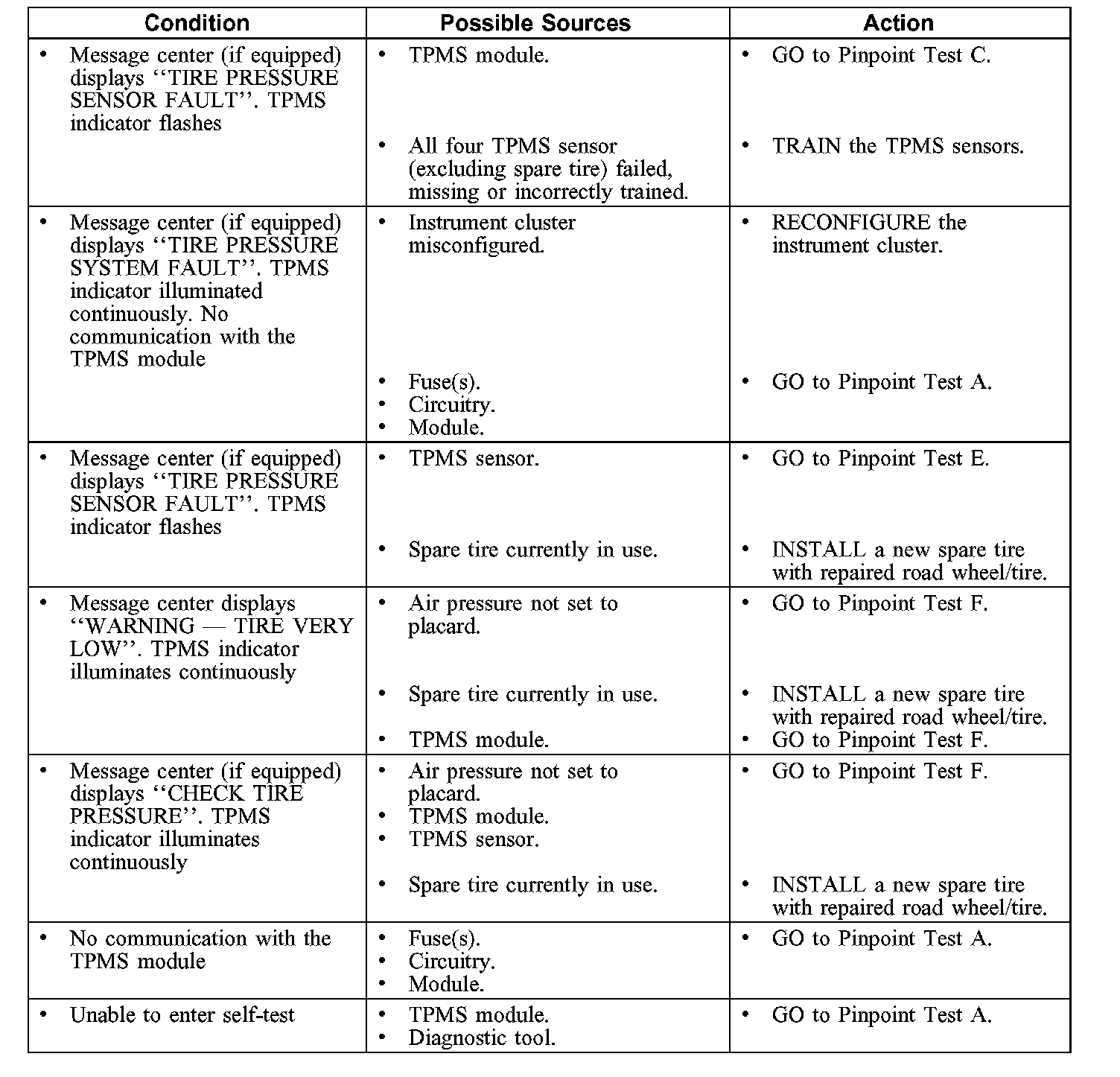 Failure of a tire pressure monitor system component may not cause the message center to display a system fault message or a DTC to be stored. The Symptom Chart is a starting point to begin diagnosis of these concerns.