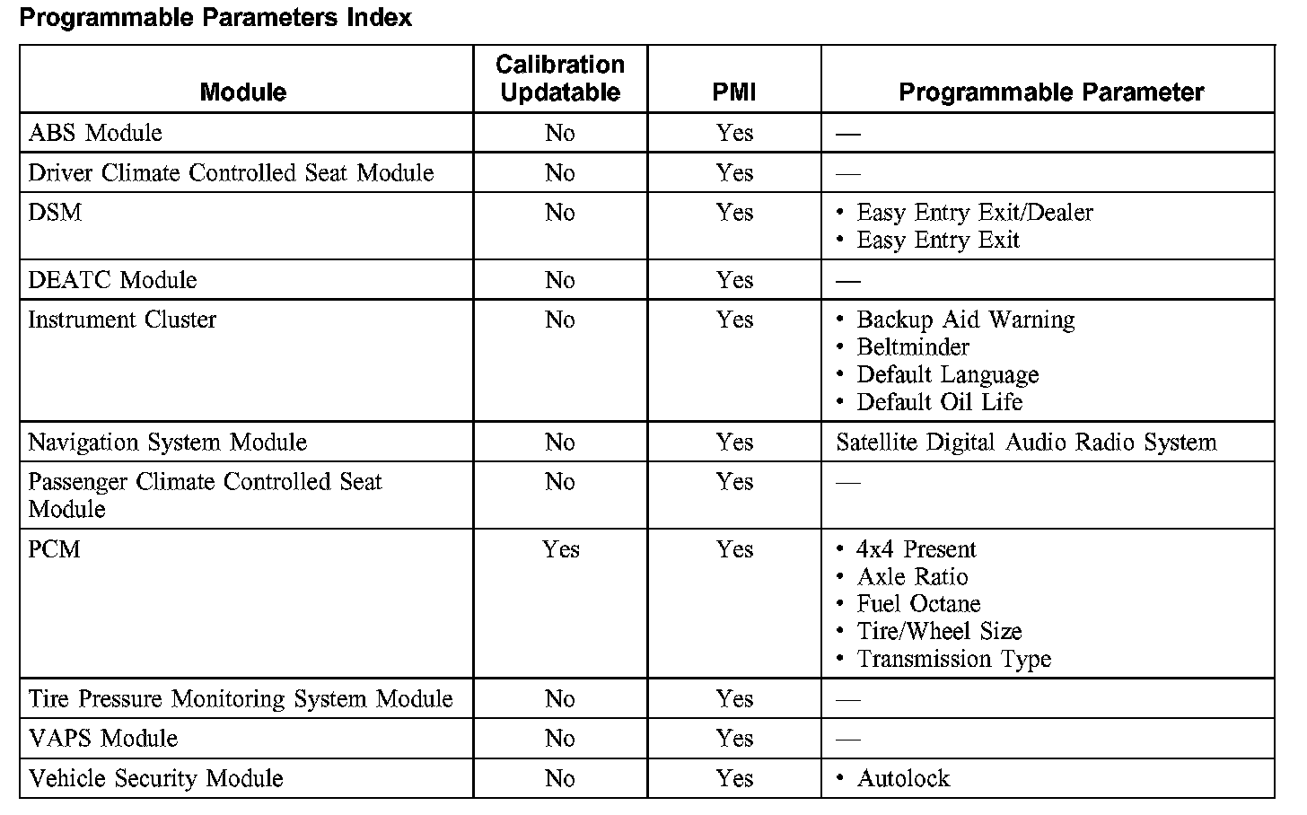 Programmable parameters: These are options contained within the existing software. These include items such as tire size, customer preference items and anti-theft options. The current settings are downloaded from an existing module then uploaded to the new module. They can also be configured using the diagnostic tool. Programming the parameters is different from updating the calibrations as no software is changed, only the options already contained in the software.