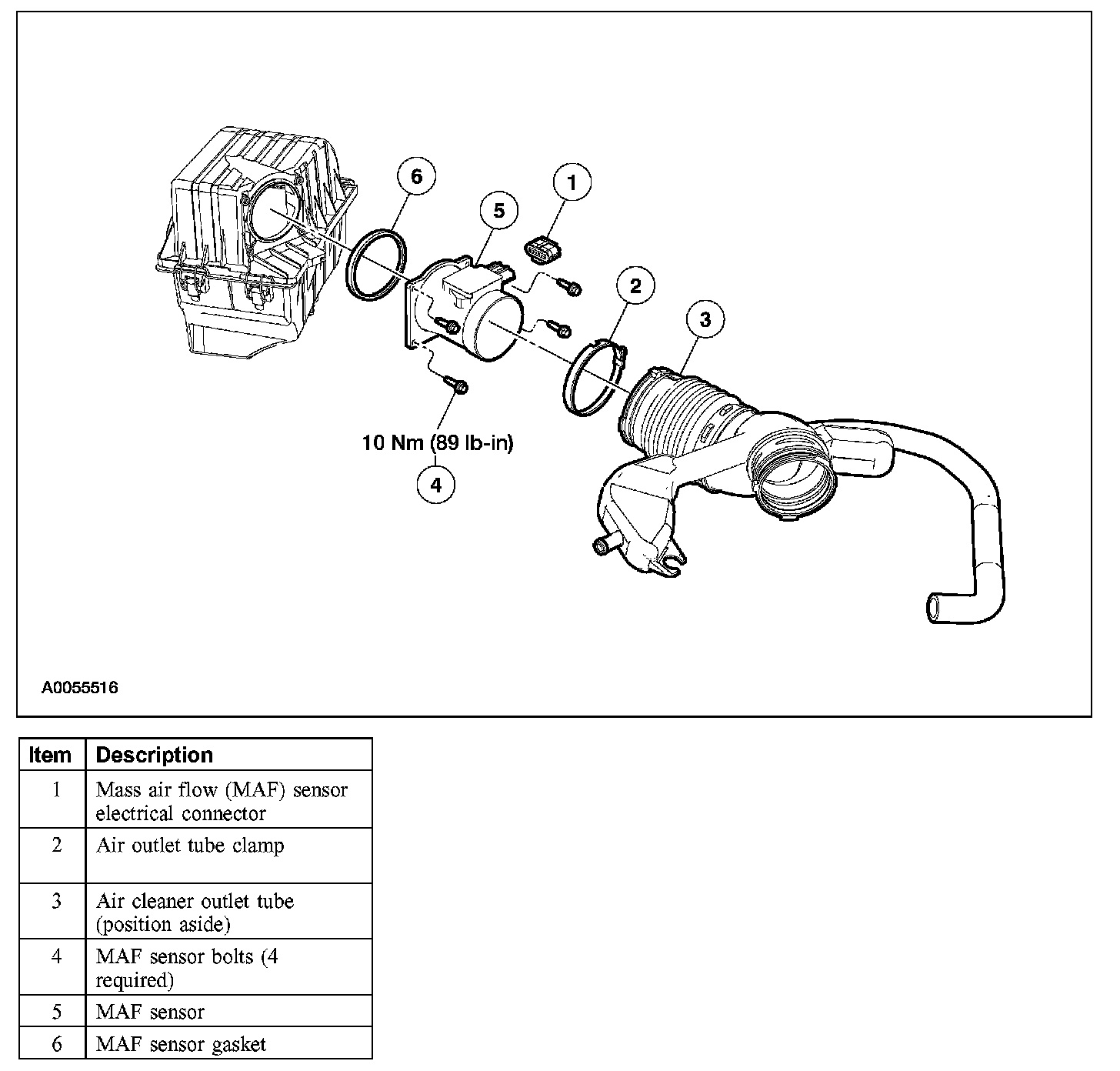 CAUTION: The mass air flow (MAF) sensor electronics module and body are calibrated as a unit and must be serviced as a unit. Do not tamper with the sensing elements located in the air flow bypass of the MAF body.