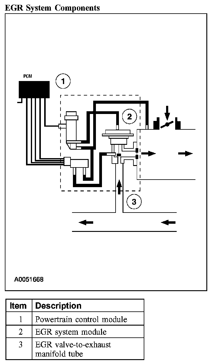 The powertrain control module (PCM) controls the EGR vacuum regulator solenoid. The EGR vacuum regulator solenoid controls the vacuum to the EGR valve. When the EGR valve opens, exhaust gas flows to the intake manifold. The EGR transducer measures the flow through the EGR valve to the exhaust manifold tube and sends a signal to the PCM.