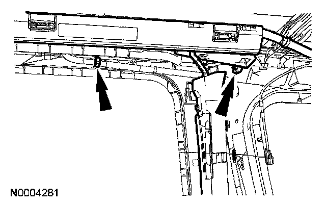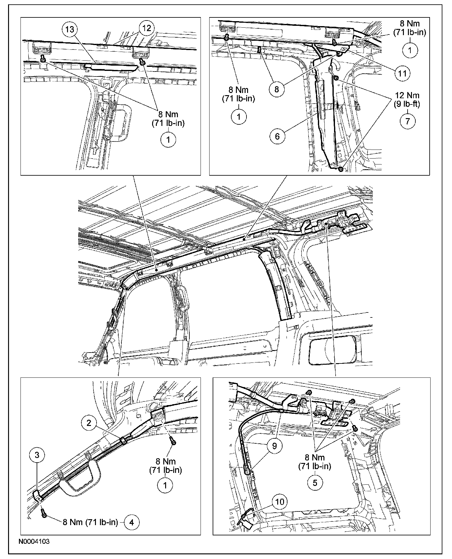 14. WARNING: Anytime the safety canopy has deployed, the headliner, and all A, B and C pillar upper trim panels and attaching hardware must be replaced along with any other damaged components and hardware. Failure to do so may result in personal injury in the event of a safety canopy deployment.