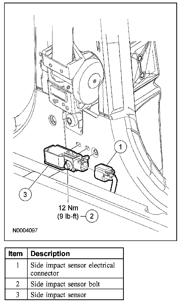 6. WARNING: The tightening torque of the air bag side impact sensor retaining bolt is critical for correct system operation.