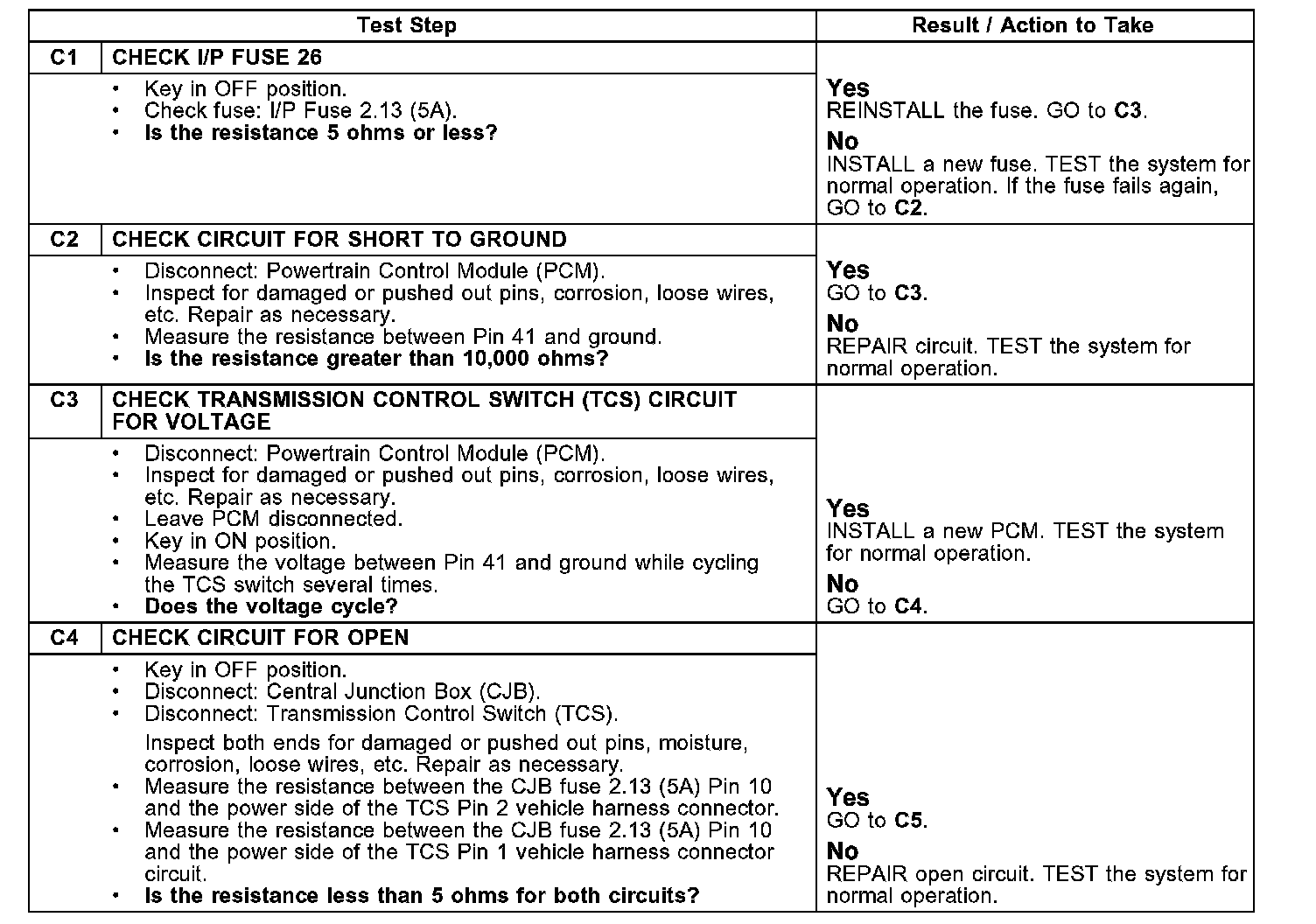 Pinpoint Test C: Transmission Control Switch (TCS) Is Not Operating CorrectlyTest C1-C4: