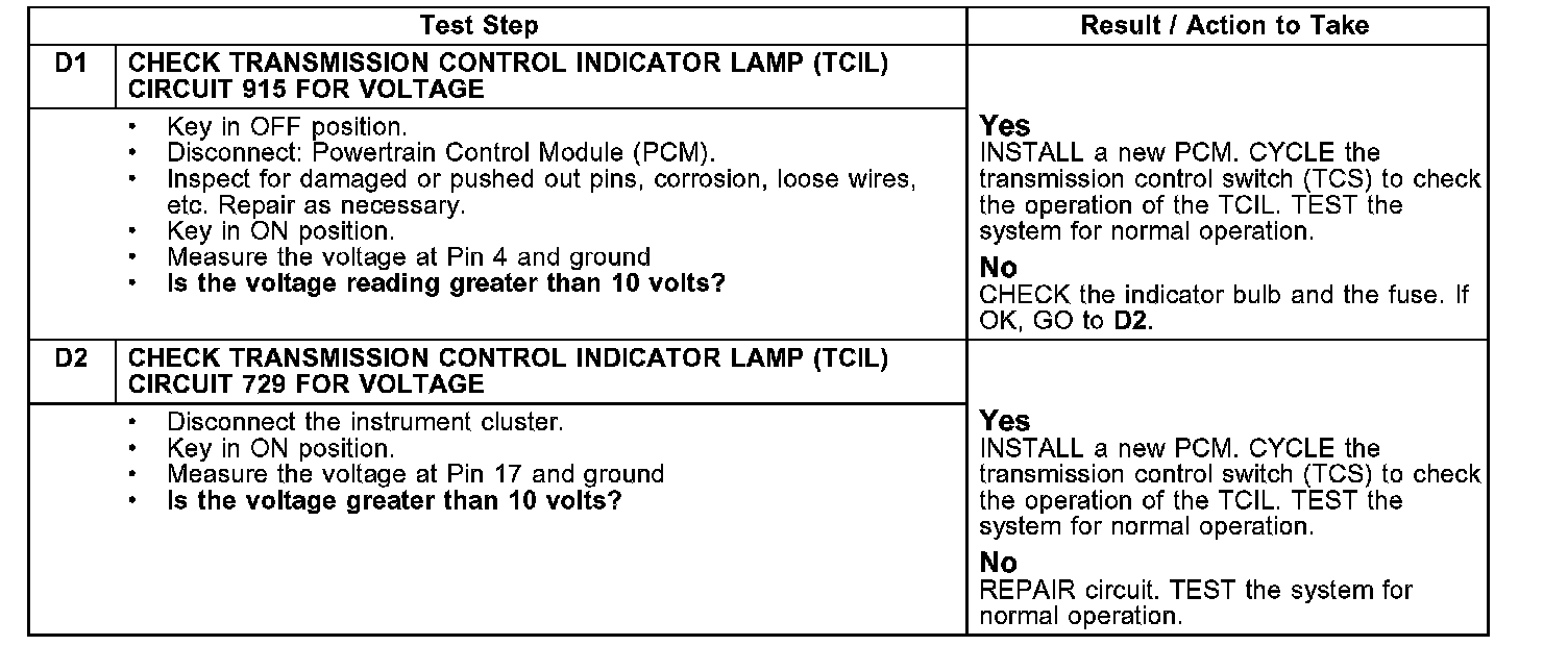 Pinpoint Test D: Transmission Control Indicator Lamp (TCIL) Does Not IlluminateTest D1-D2: