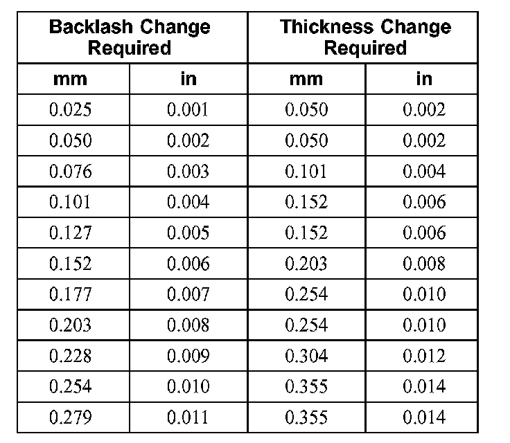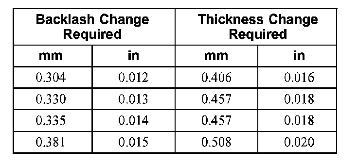 43. To correct for high or low backlash, increase the thickness of one differential bearing shim and decrease the thickness of the other differential bearing shim by the same amount. Refer to the Differential Shim Size Chart when adjusting the backlash. When the backlash is within specifications, install the differential assembly.