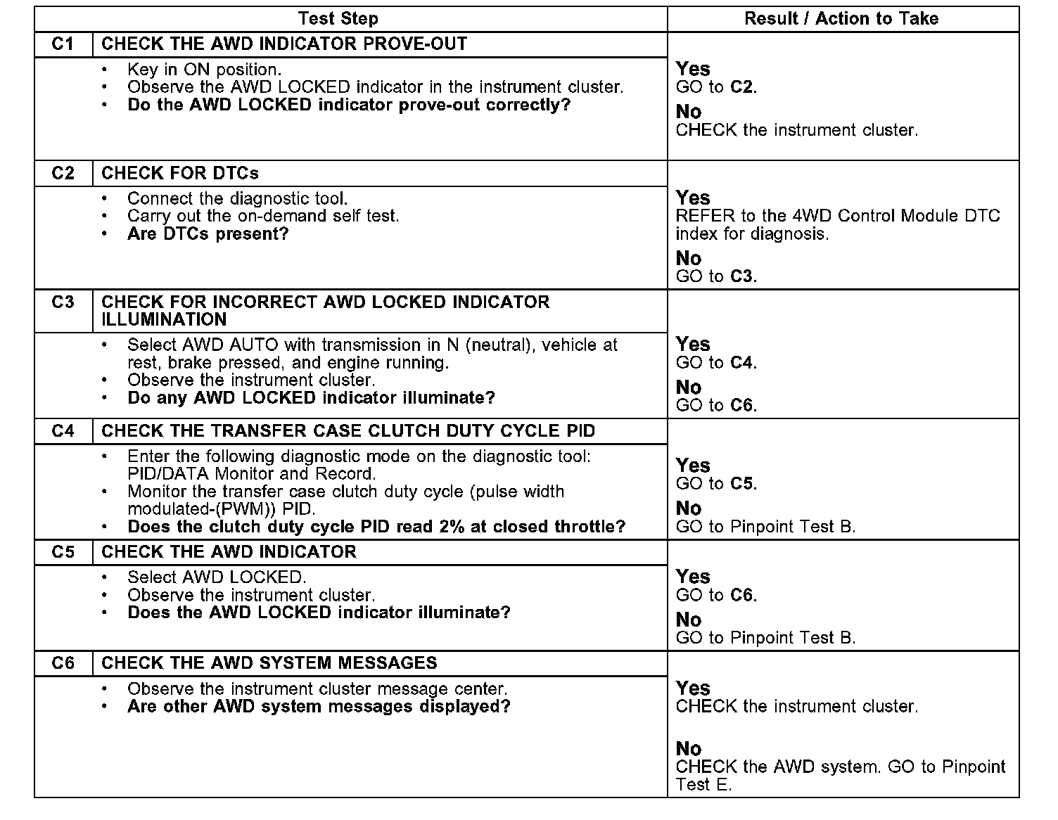 Pinpoint Test C: The AWD Indicator Does Not Operate Correctly/Does Not Operate/FlashesTest C1-C6:
