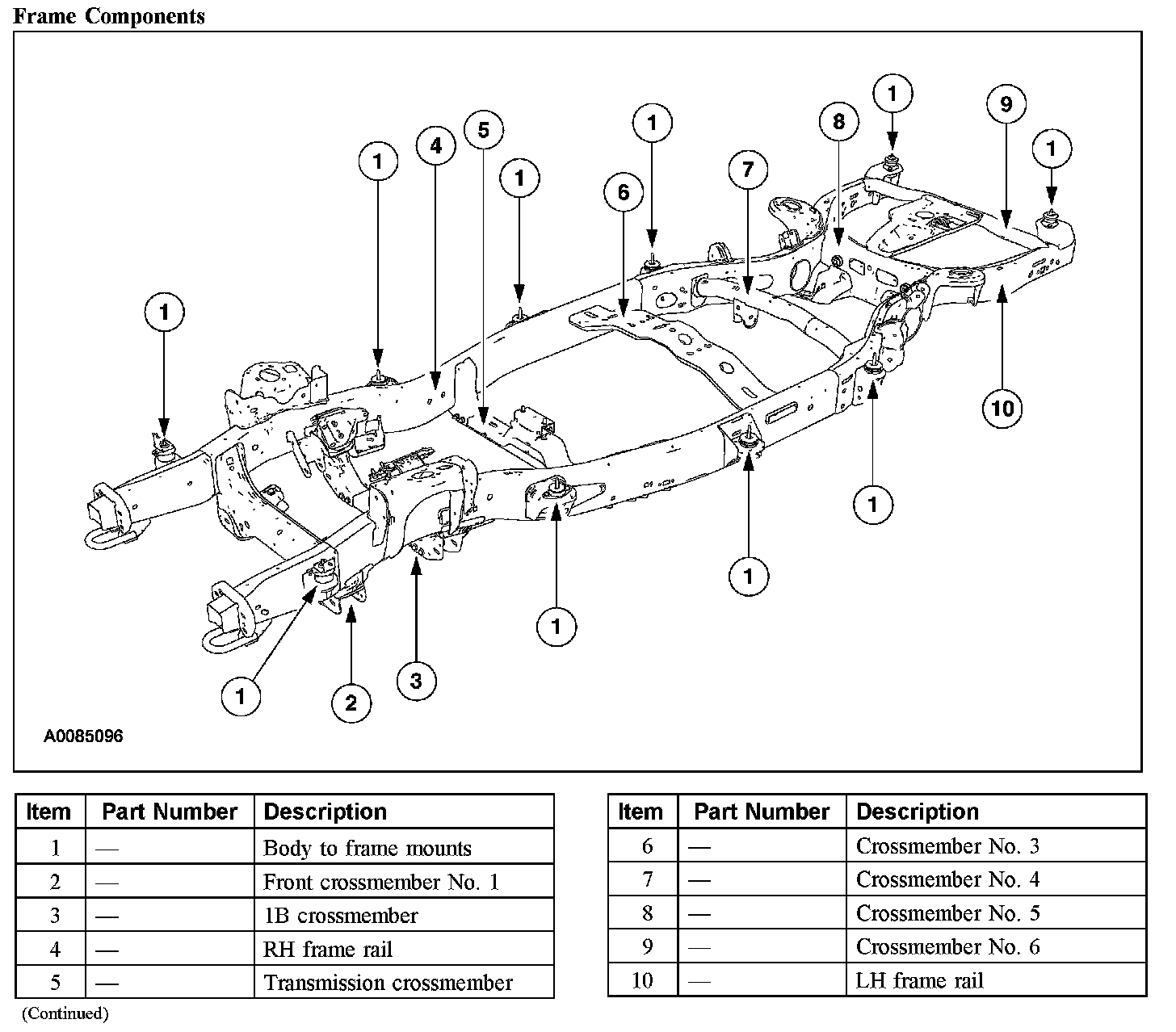 The frame (5005) is made up of two steel boxed side rails and crossmembers, which are welded to the two side rails. The transmission crossmember is bolted to the side rails. The side welded rails and crossmembers are not replaced separately.