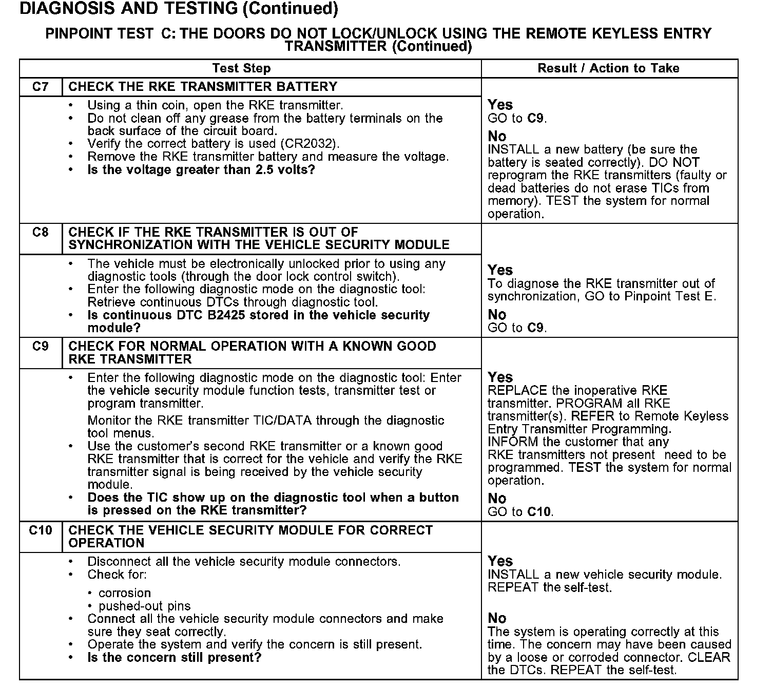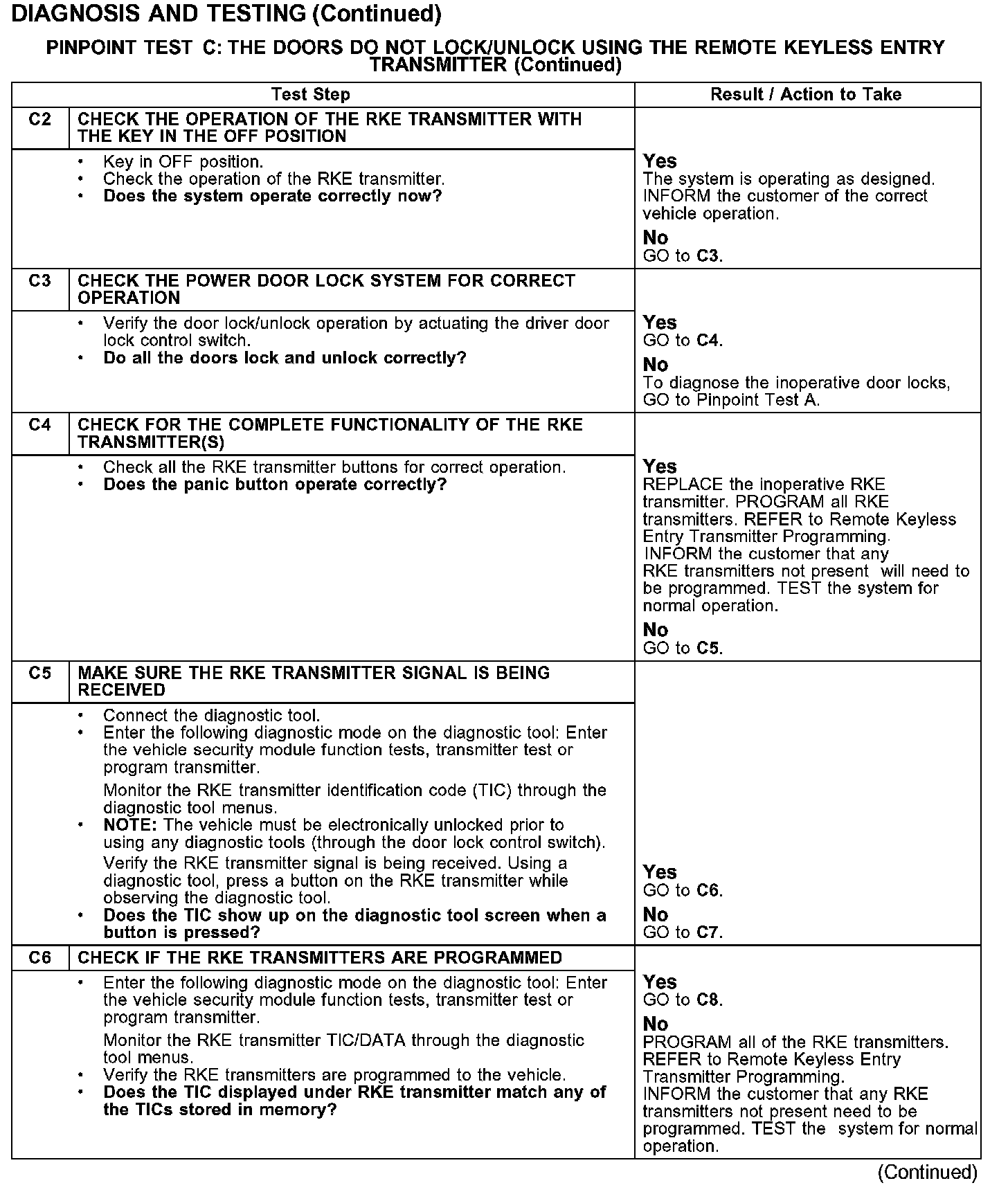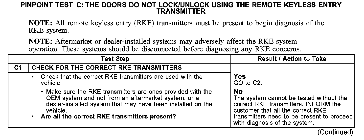 PINPOINT TEST C: THE DOORS DO NOT LOCK/UNLOCK USING THE REMOTE KEYLESS ENTRY TRANSMITTER
