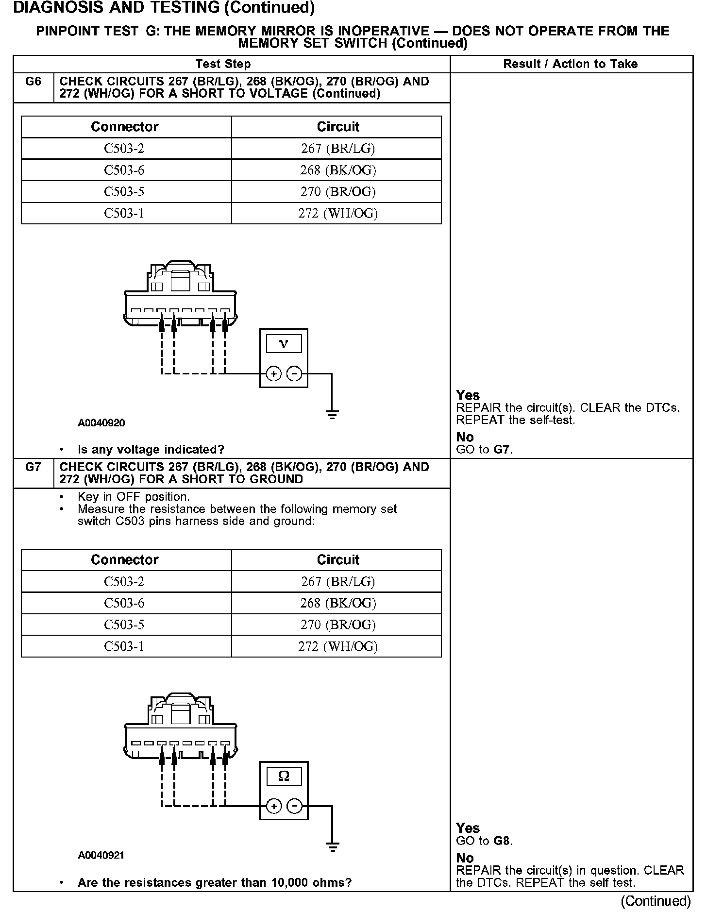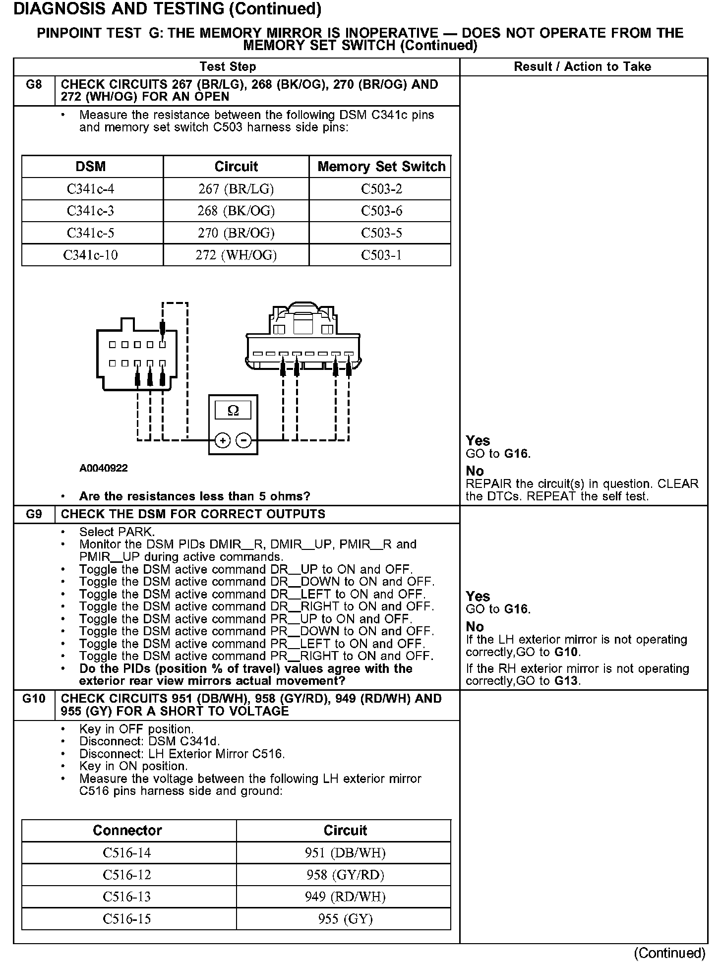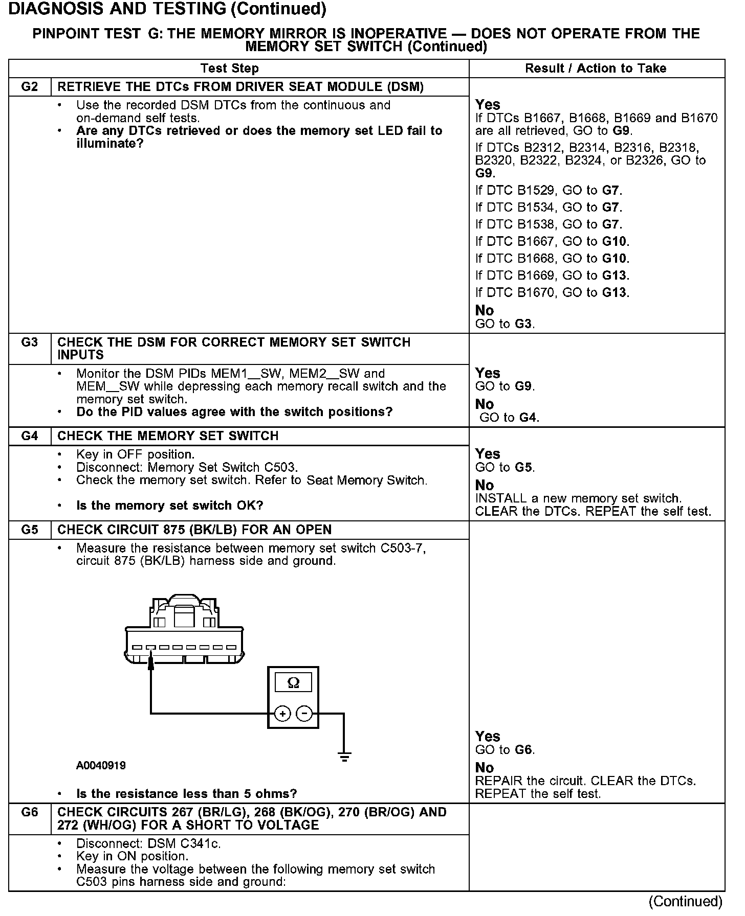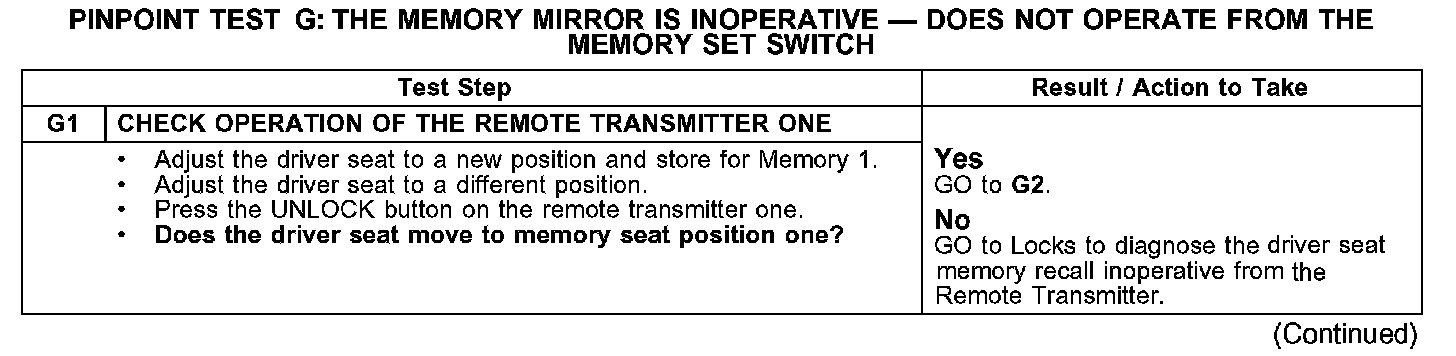 PINPOINT TEST G: THE MEMORY MIRROR IS INOPERATIVE - DOES NOT OPERATE FROM THE MEMORY SET SWITCH