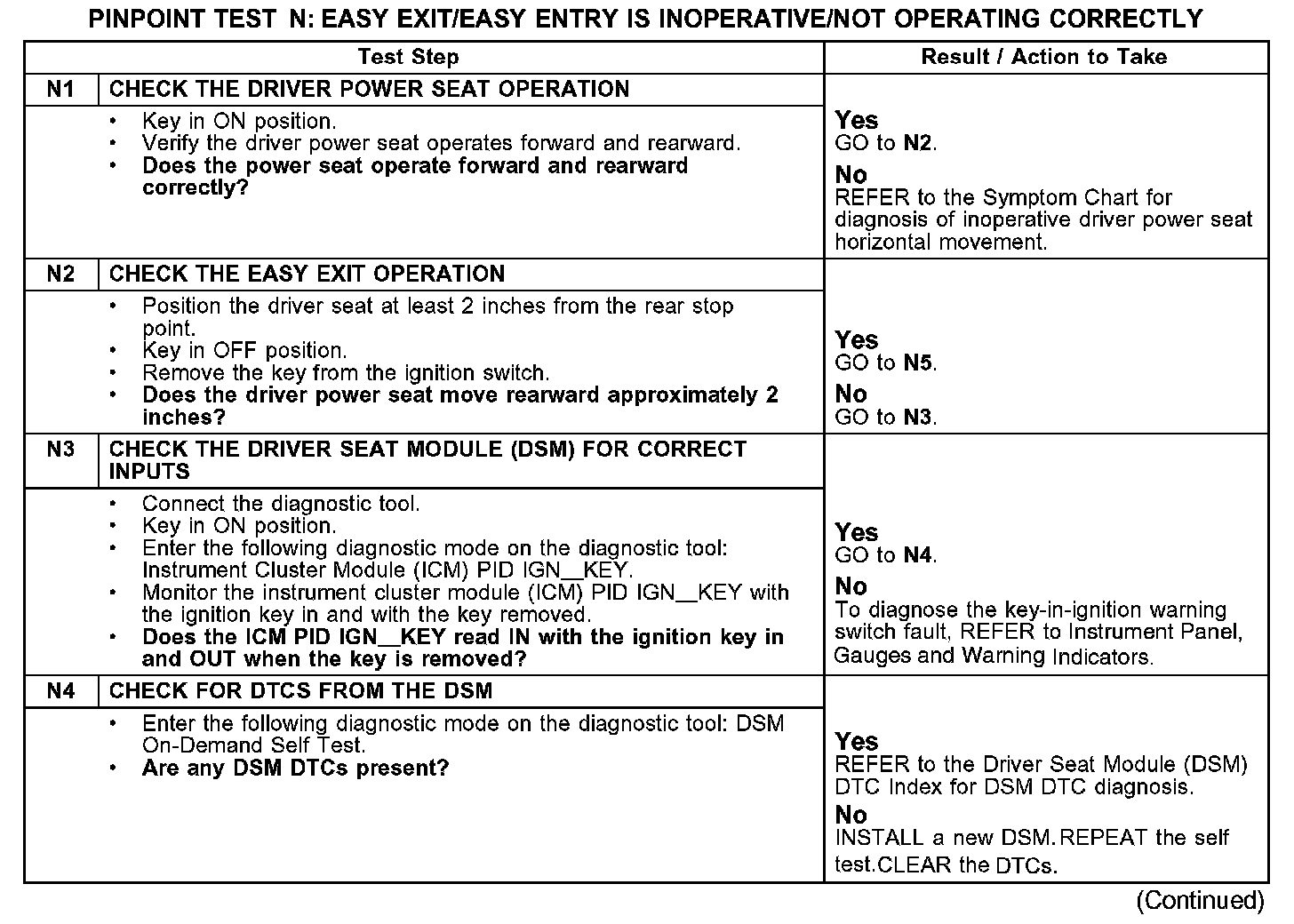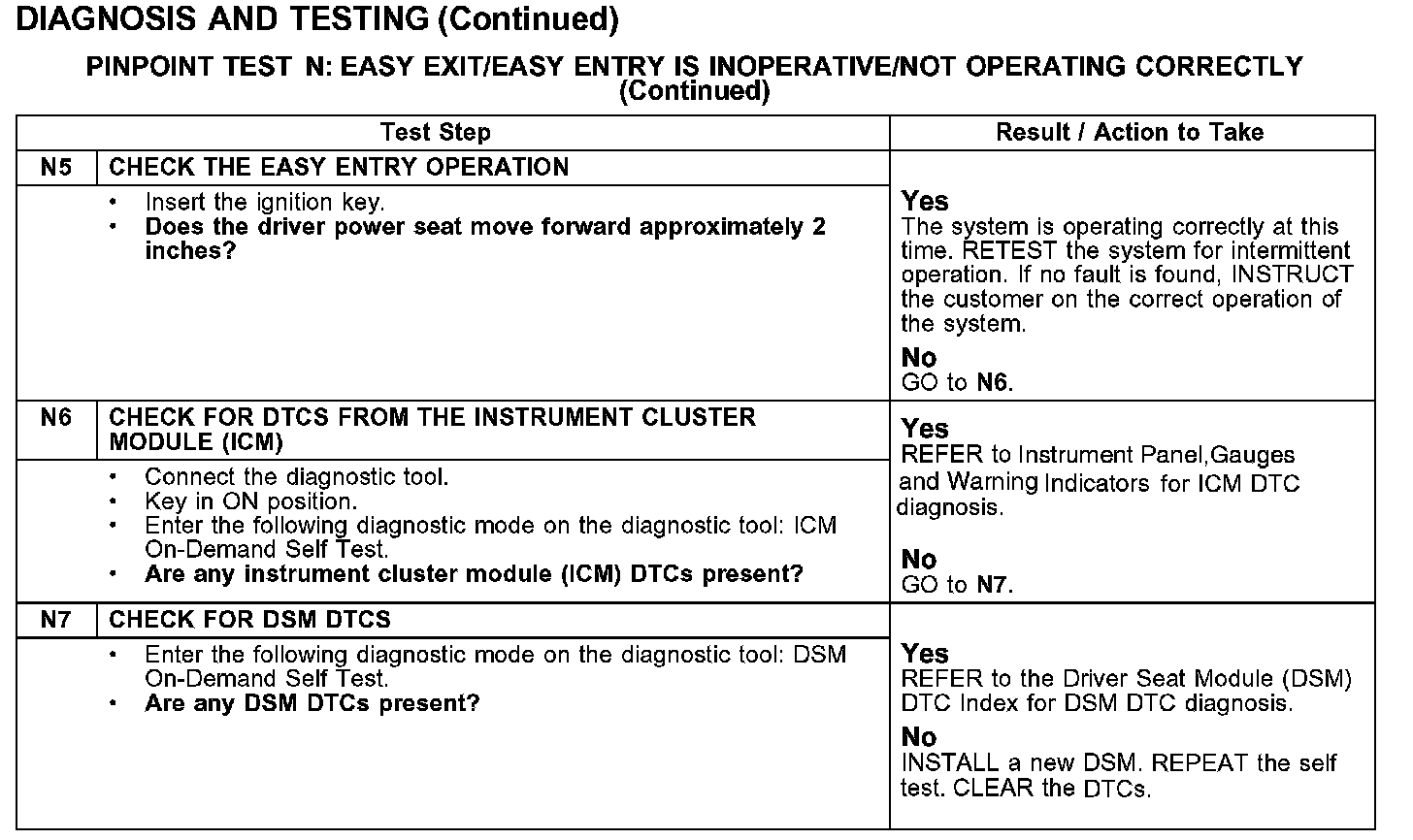 PINPOINT TEST N: EASY EXIT/EASY ENTRY IS INOPERATIVE/NOT OPERATING CORRECTLY