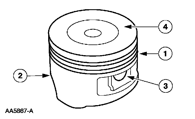 1. Clean and inspect the (1) ring lands, (2) skirts, (3) pin bosses and the (4) tops of the pistons. If wear marks, scores or glazing is found on the piston skirt, check for a bent or twisted connecting rod.