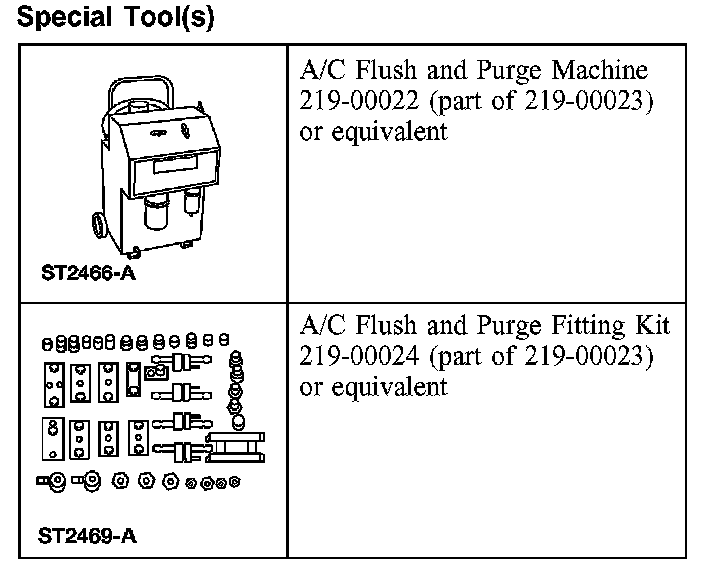 - Only the A/C Flush and Purge Machine kit 219-00023, which includes A/C Flush and Purge Machine 219-00022, A/C Flush and Purge Fitting Kit 219-00024, and A/C Systems Flushing Solvent, is approved for use on Ford vehicles. No other flushing device or solvent is approved for flushing heat exchangers (A/C condenser, A/C evaporator). Use of any other flusher or solvent may cause damage to the A/C system and the flushing unit.