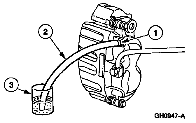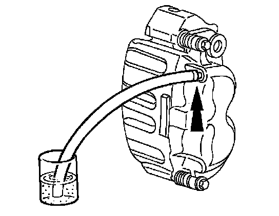 1. Connect a clear waste line to the RH rear disc brake caliper bleeder screw and the other end in a container partially filled with recommended brake fluid.