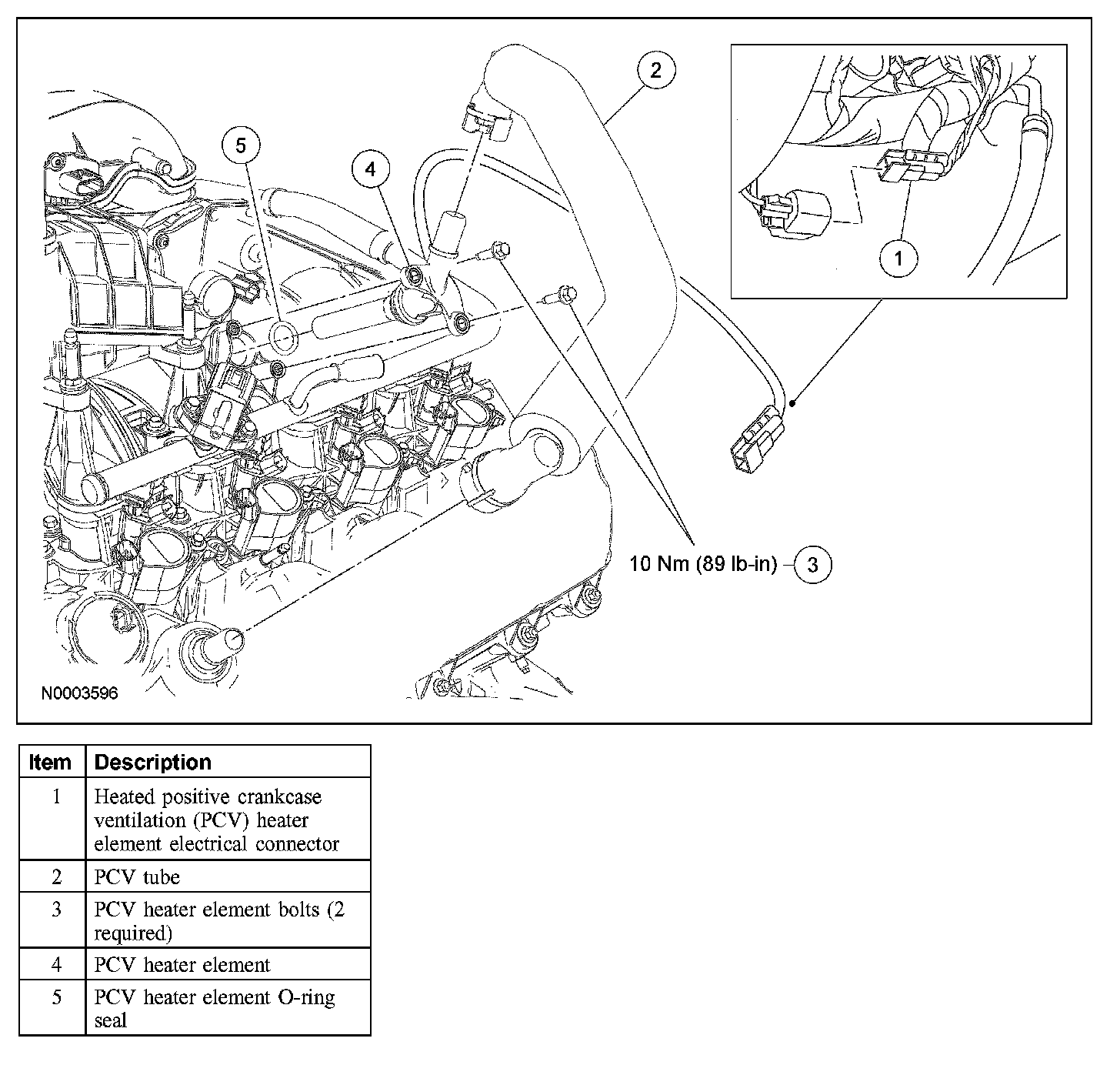 Using a new O-ring seal, install the PCV heater element and the bolt.