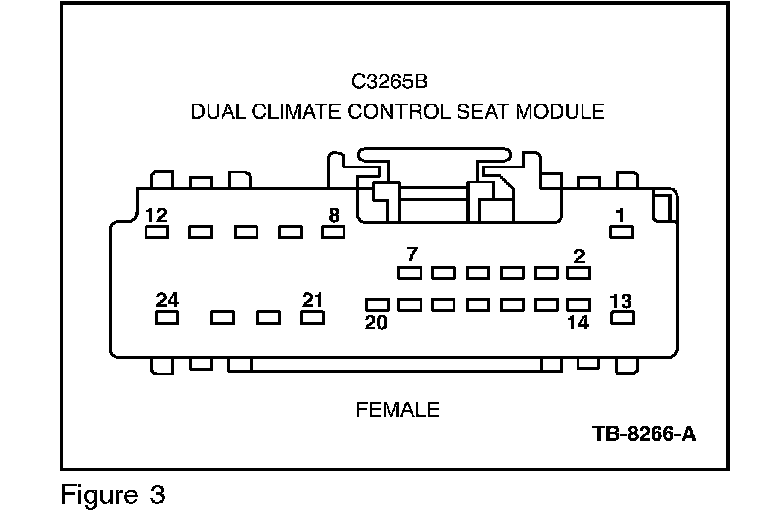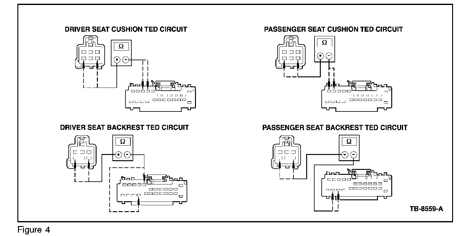 4. Check for short to ground or voltage in the thermistor circuit. (As shown on TED connector (C3034 - Driver Back, C3035 - Driver Cushion, C3039 - Passenger Back, or C3040 - Passenger Cushion). (Figure 1)