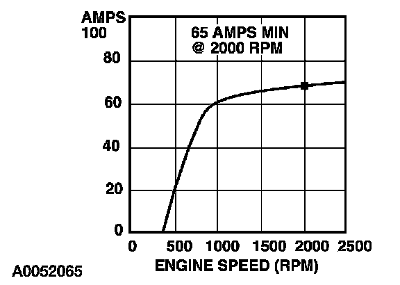 4. With the engine running at approximately 2,000 rpm, adjust the tester load bank to determine the output of the generator. Generator output should be greater than the graph shown. If not, refer to the pinpoint test or GO to Symptom Chart. Pinpoint Tests Symptom Related Diagnostic Procedures