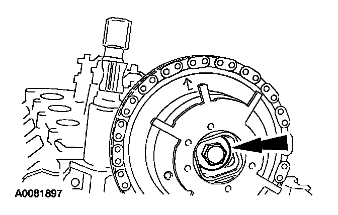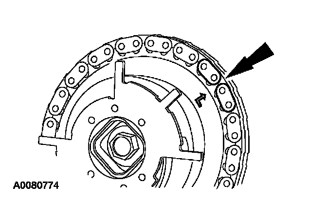 Position the timing chain on the camshaft sprocket with the camshaft sprocket timing mark positioned between the two copper (marked) chain links.