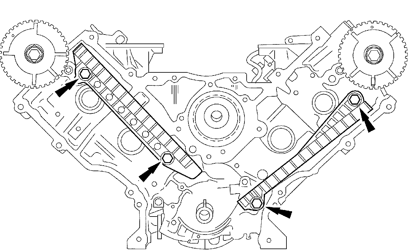 21. NOTE: Make sure the upper half of the timing chain is below the tensioner arm dowel.